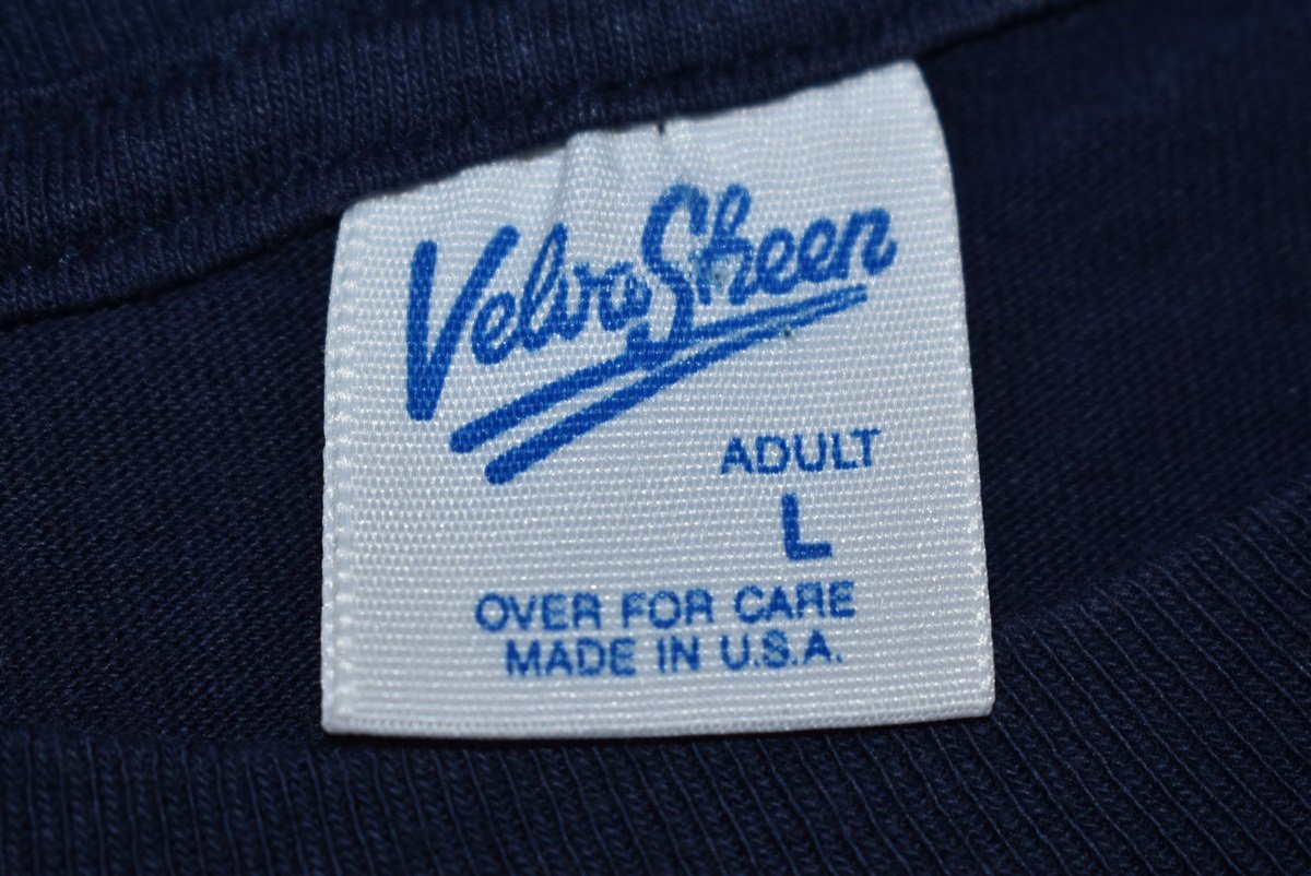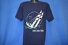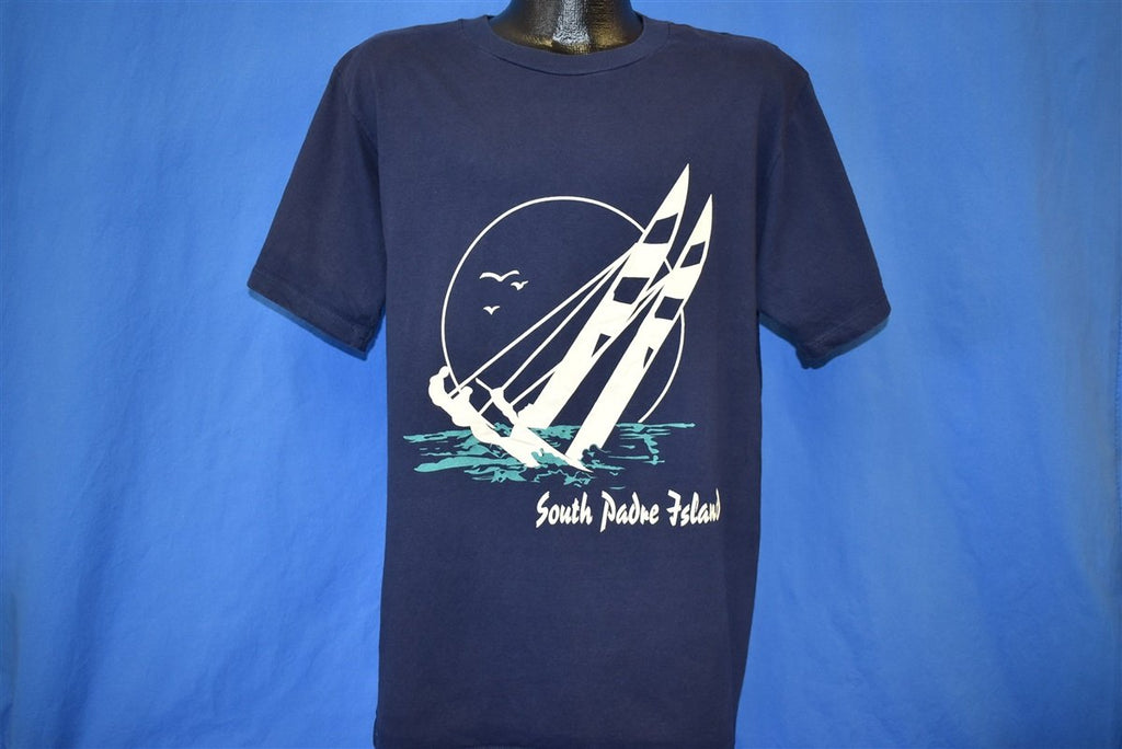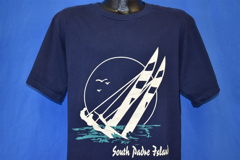This 90s vintage tee showcases the seascape of South Padre Island, Texas. The graphic shows a catamaran sailboat gliding through calm waters while a sun sets peacefully on the horizon.