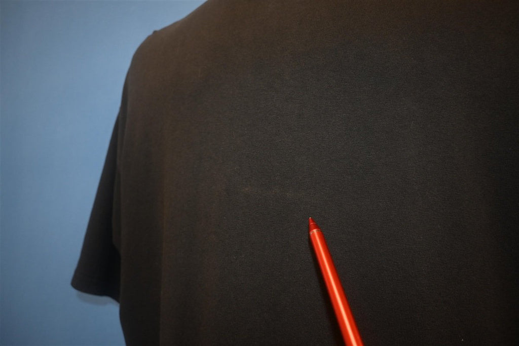 Fits like a modern unisex adult oversized large. There's some very light discoloration on the back, see pics.