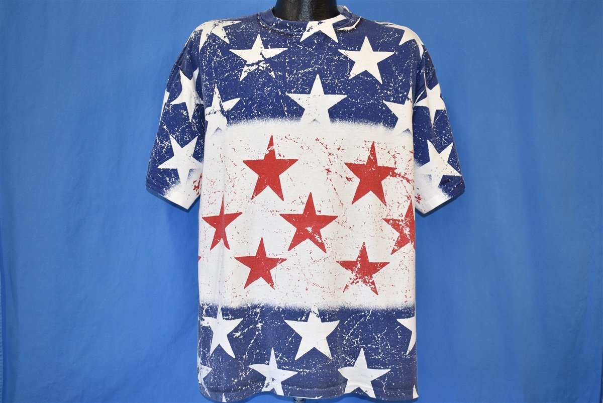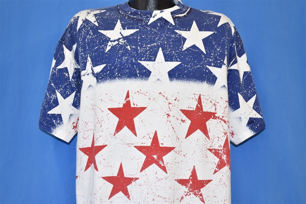 This vintage tee is the epitome of American pride and nineties fashion. It's loaded with wild star graphics, all over print, and a cool splatter paint effect. The red, white, and blue color scheme makes this the perfect patriotic get up for 4th of July BBQs, Memorial Day celebrations, or Veteran's Day parties.