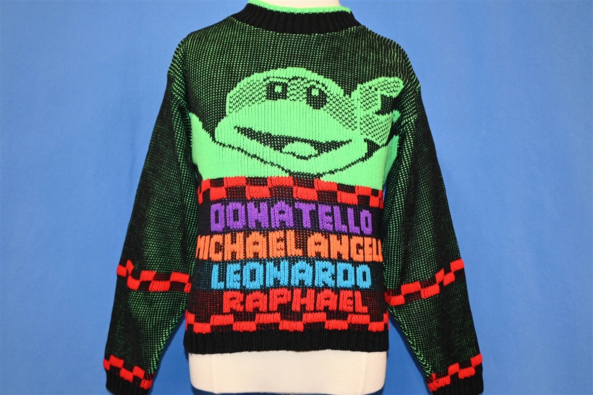 This awesome intarsia knitted sweater has a colorful design paying tribute to the Teenage Mutant Ninja Turtles. There is a turtle knitted on the front along with the names of the four TMNT members: Donatello, Michaelangelo, Leonardo, and Raphael. The Ninja Turtles first appeared in a comic book series written by Kevin Eastman and Peter Laird, which was designed to poke fun at a variety of common comic superhero tropes. Since their debut in 1984, the Turtles have become the stars of a media franchise they've appeared in multiple movies, television series, and video games.