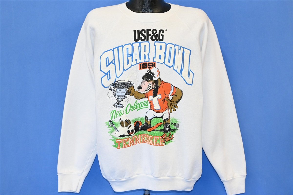 This sweet college football sweatshirt reps the Tennessee Volunteers of the University of Tennessee, and it celebrates their victory at the 1991 Sugar Bowl in New Orleans. This was the Vols' first Sugar Bowl in five years and they were favored to win, but it wound up being a tense game against the Virginia Cavaliers. By halftime, the Cavaliers were ahead by sixteen points, but the Vols pulled off an impressive win when they scored three touchdowns in the fourth quarter. This left the final score at 22 to 23, the Vols winning by just a single point.