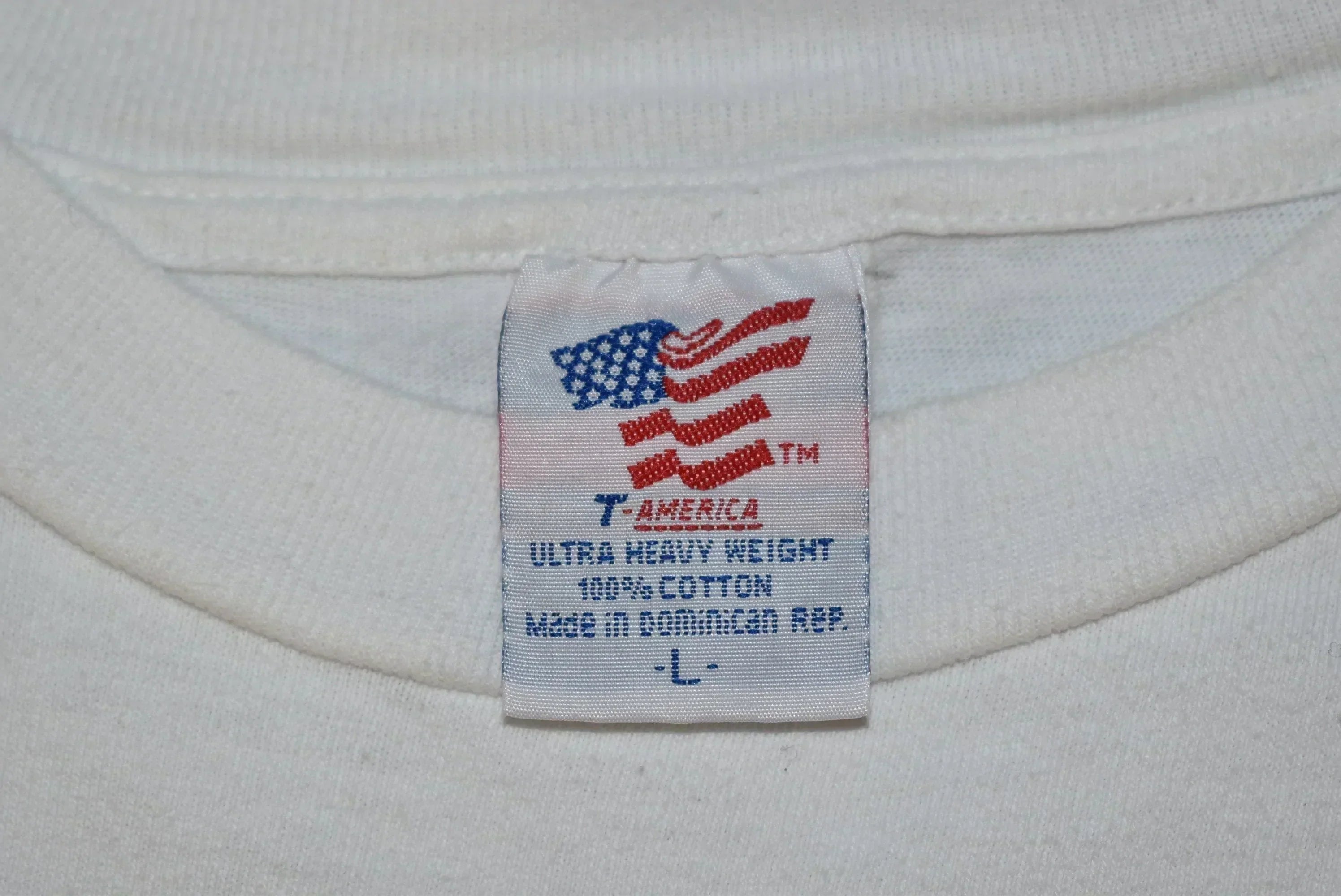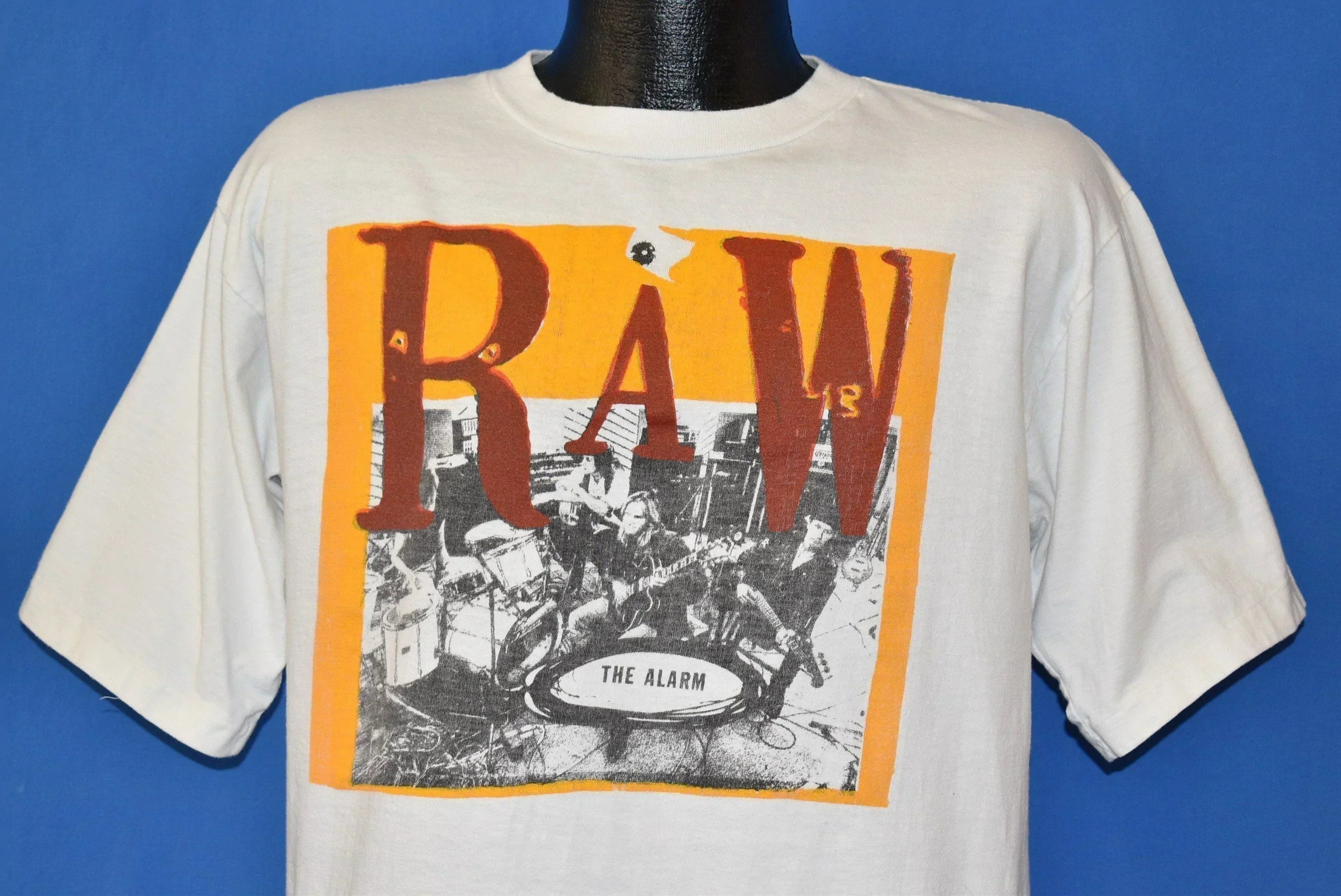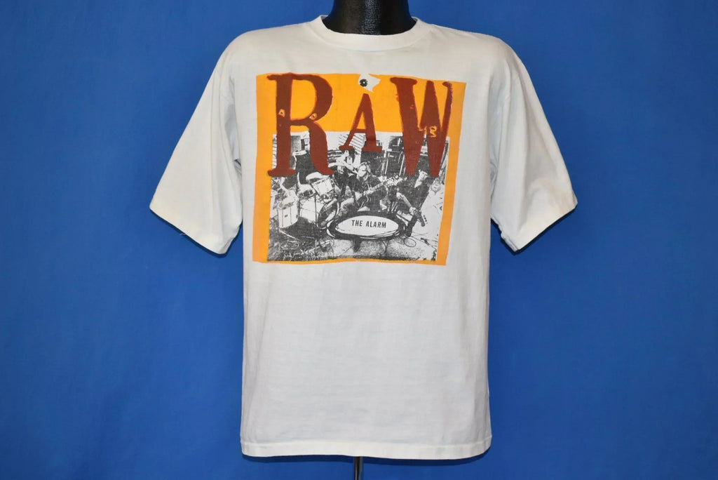 This shirt has The Alarm's final album cover on the front. "Raw" was released 1991, and the band split up soon after. On the back of the shirt, it says "The Alarm Raw 1991 World Tour". The Alarm are a Welsh New Wave band that formed initially as a punk band in 1977. In the 80s, they opened for popular acts such as Bob Dylan and U2. The band's sound comes in part from the Welsh language and culture.