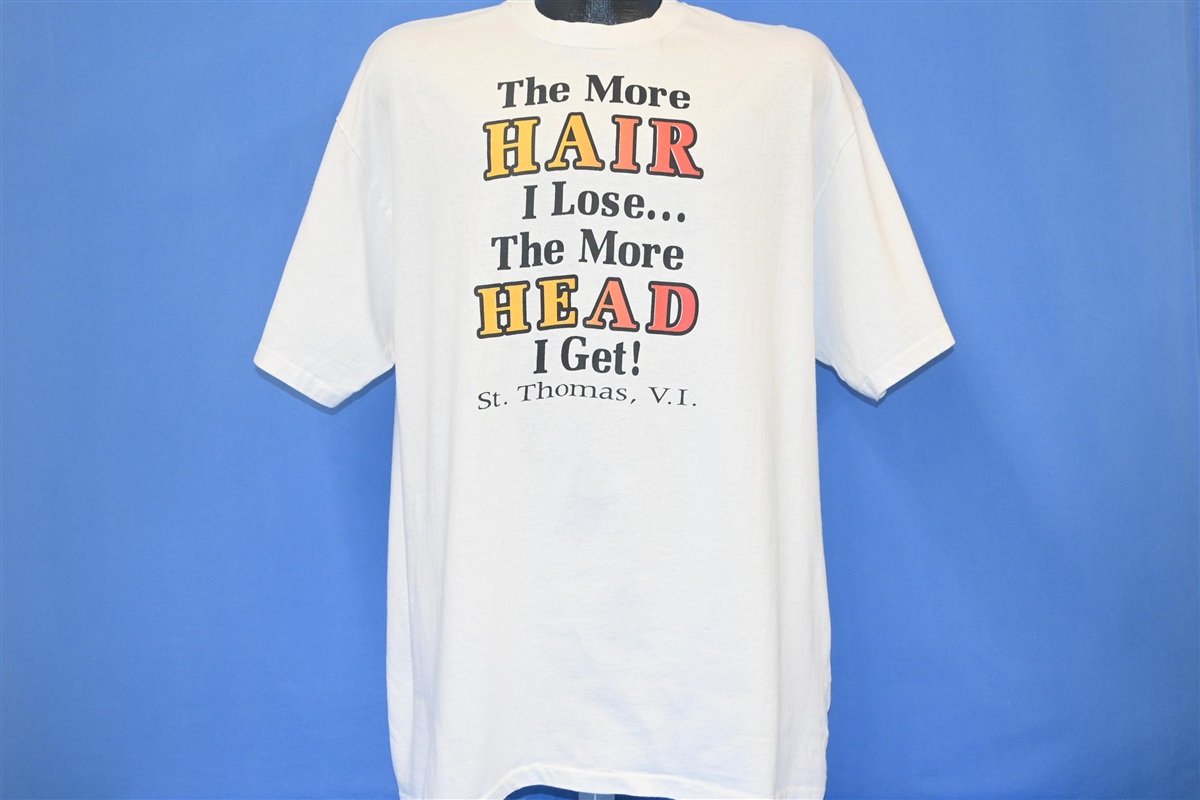 This hilarious tee reminds everyone that there's nothing wrong with a thinning head of hair. This shirt is a comical souvenir from the US Virgin Island of St. Thomas, and it reads, "The more hair I lose... the more head I get!" The clever double entendre makes for a great vintage tee to celebrate a trip to the Caribbean destination.