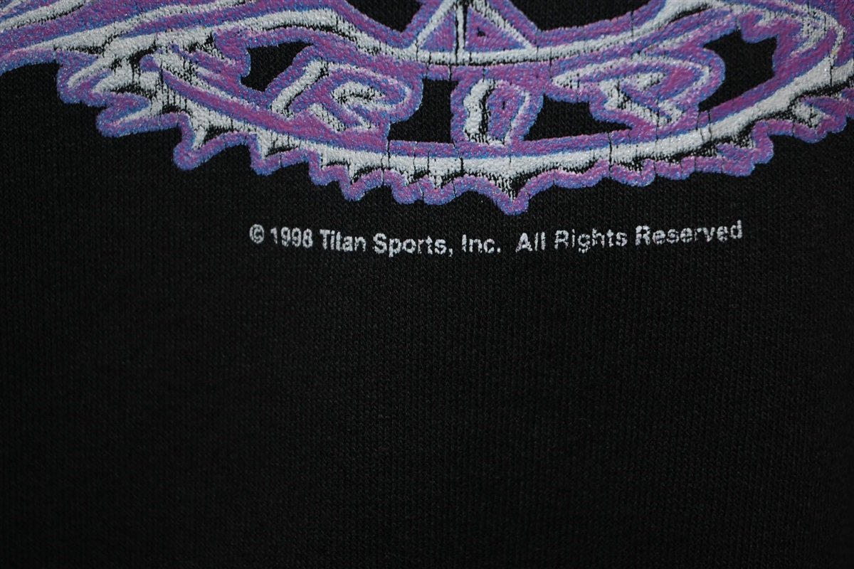 This awesome sleeveless sweatshirt features the iconic WWF star, The Undertaker. This sweatshirt features a wonderfully haunting image of the wrestler during his Lord of Darkness era in the late 90s. When The Undertaker first introduced his unique character to the World Wrestling Federation, he drew inspiration for his persona from the village undertakers portrayed in old western TV shows. This version of the wrestler later "died" during a casket match at the 1994 Royal Rumble.