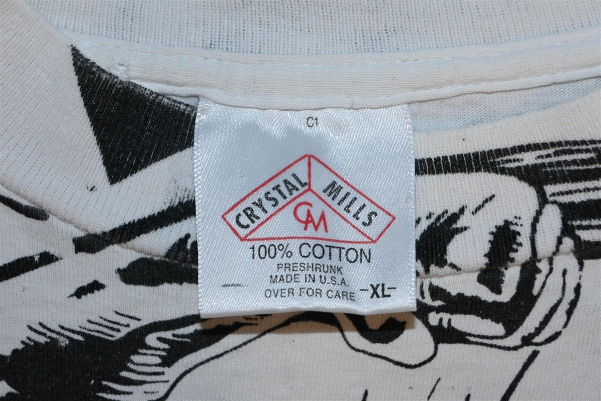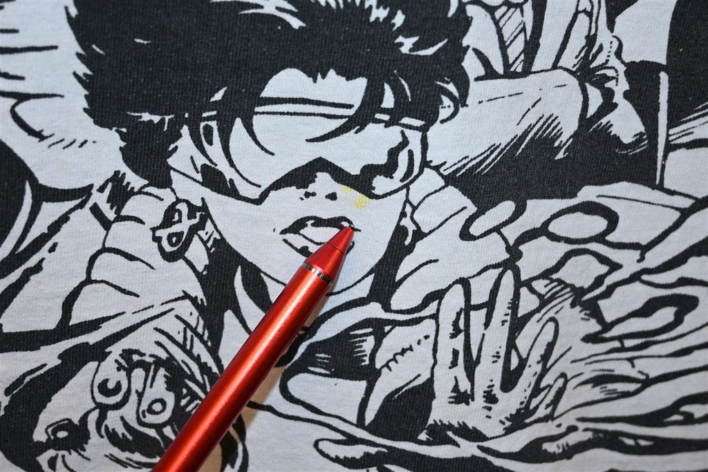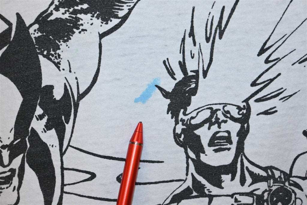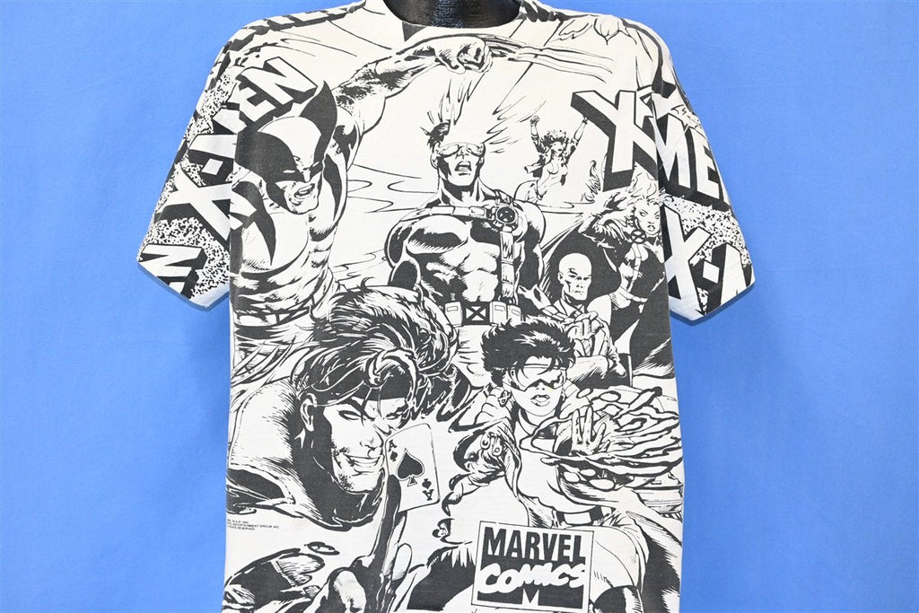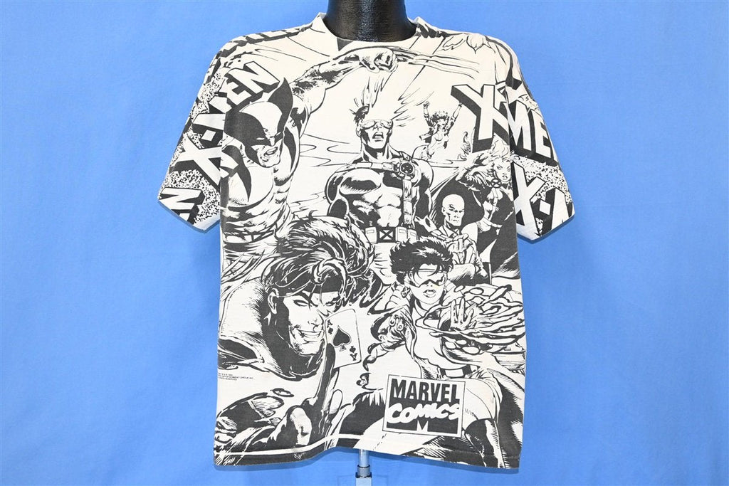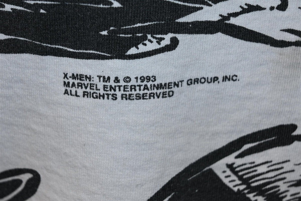 This amazing all over print tee was made in the 90s, and it showcases the popular Marvel superhero team, the X-Men. This shirt is copyright 1993, when Marvel launched a second series featuring the characters that was simply titled X-Men. The team's roster was split into two strike forces: a Blue Team, which was chronicled in this new series, and a Gold Team that was the focus of The Uncanny X-Men comics. This shirt features primarily the members of Blue Team, which was headed by Cyclops, and also consisted of Wolverine, Beast, Jubilee, Rogue, Psylocke, and Gambit.