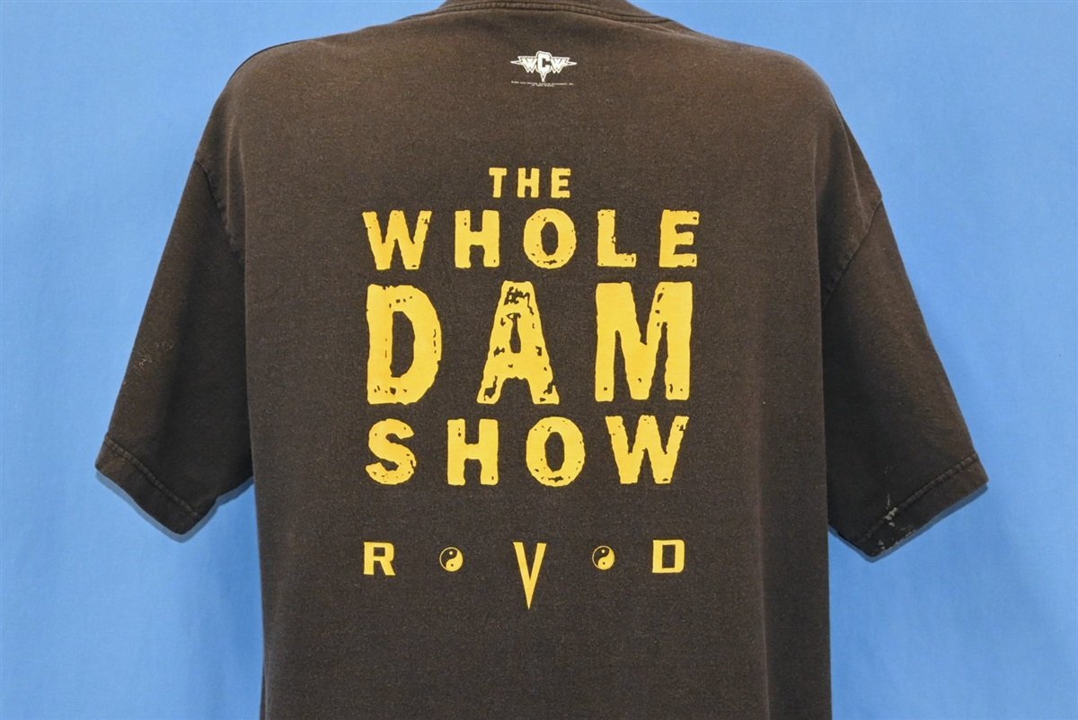 This sweet double-sided wrestling tee is for Rob Van Dam, and it refers to him as "The Whole Dam Show". This shirt was made in 2001, when Van Dam joined the World Wrestling Federation as a part of the franchise's "Invasion" storyline. This storyline purported to involve wrestlers from World Championship Wrestling and Extreme Championship Wrestling teaming up to take down the WWF. In actuality, ECW was shut down in 2001 and its wrestlers were forced to find work elsewhere. Van Dam was a welcome addition to the WWF, as he had previously been ECW's longest-reigning World Television Champion.