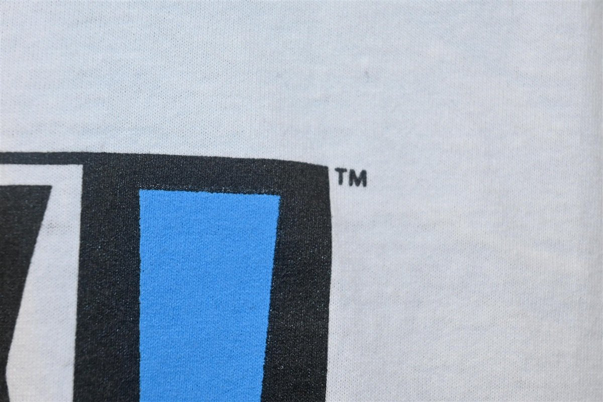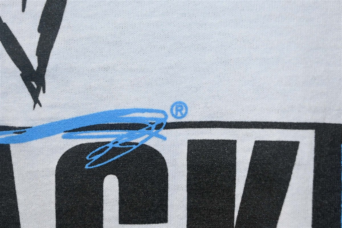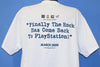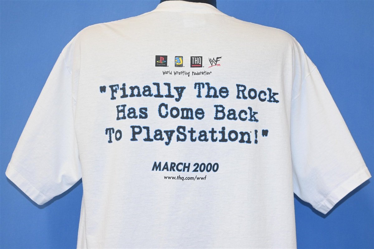 This awesome shirt is for the Playstation video game WWF Smackdown! which featured wrestlers from the World Wrestling Federation. The back announces the game's release in March of 2000 and it also includes the quote, "Finally The Rock has come back to Playstation!" This was the first in a long-running series of pro wrestling video games for the Playstation to be published by the California-based company THQ.