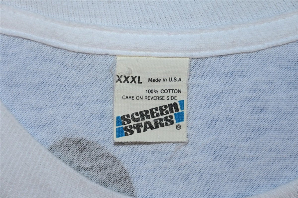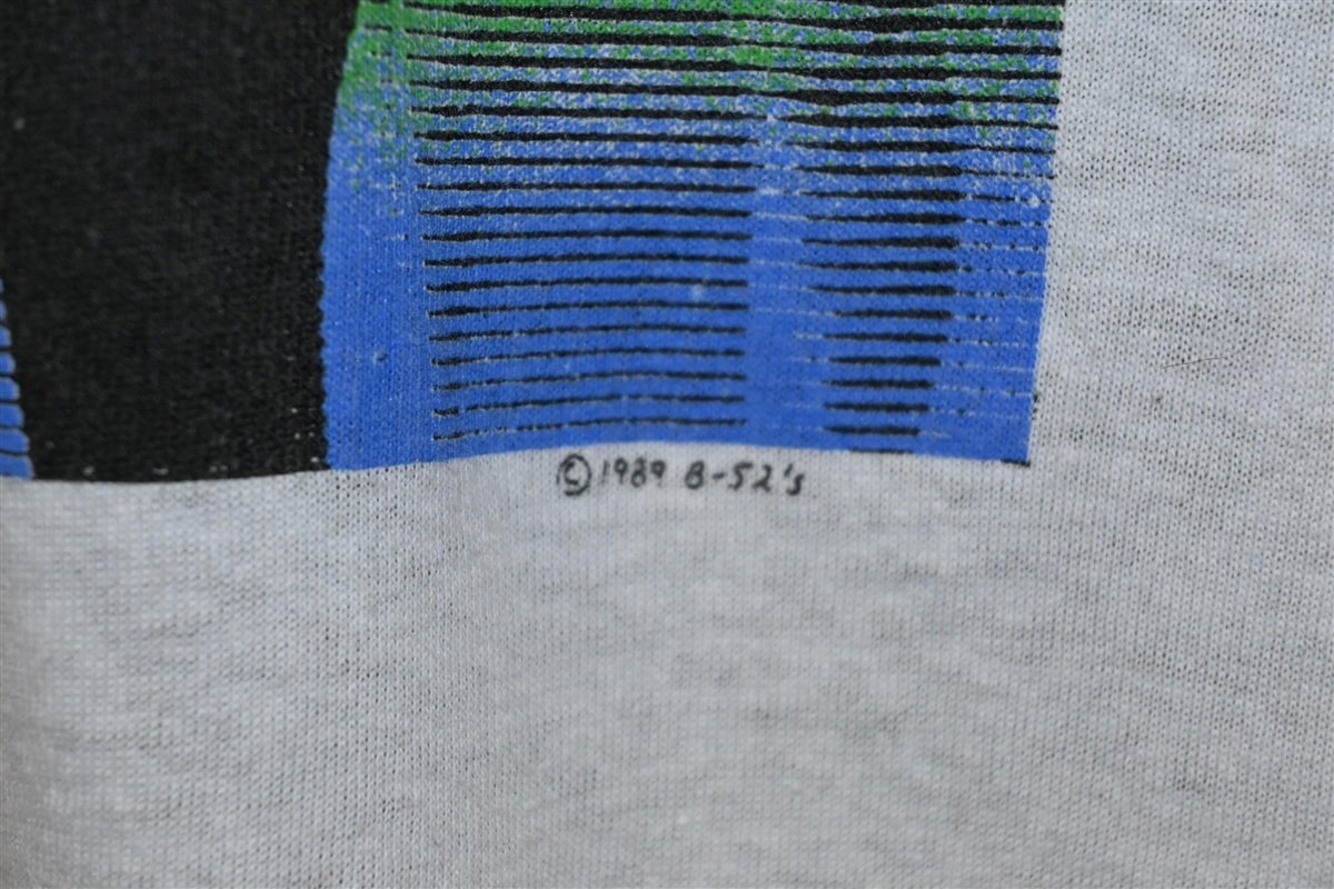 This awesome double-sided tee is for the B-52s, and it commemorates their Cosmic Thing Tour that was launched in 1989. This was the group's first concert tour since the tragic loss of their guitarist, Ricky Wilson. Wilson passed just a few months after the band recorded their fourth studio album, Bouncing off the Satellites. The album was released roughly a year later, but the band needed time to grieve before they were ready to continue recording and performing. Cosmic Thing marked the band's epic return, and the record became the best-selling album in the US for 1990.