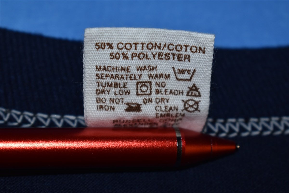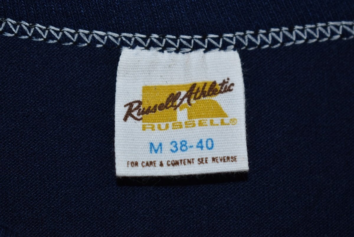 This navy blue t-shirt was made back in the 80s and features a cool logo graphic that says the word basketball. The graphic includes a copyright from Quik-Set. The shirt could be related to the Quikset Anywhere Basketball game created by Franklin Sports. The Franklin company made several recreational basketball sets for people to enjoy the game without the need for a court. The hoops can be set up anywhere for gameplay similar to the basketball games often found at arcades.