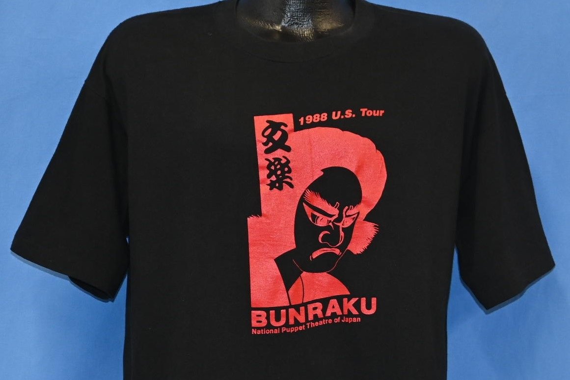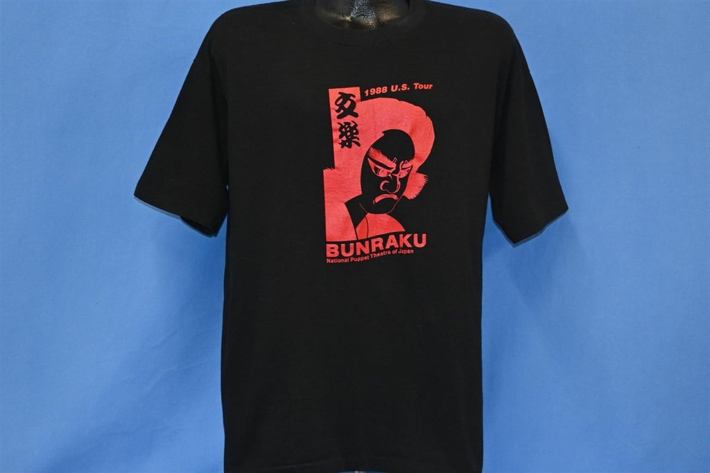 This awesome shirt commemorates the 1988 US Tour of Bunraku: The National Puppet Theatre of Japan. This touring show showcased the art of bunraku, a traditional form of Japanese puppet theater that dates back to the 17th century. The show was produced by the Bunraku Kyokai, a Japanese non-profit organization dedicated to preserving this stunning traditional art form. Over the decades, The National Puppet Theatre has performed multiple tours across the US, and the troupe has been recognized by the United Nations Educational Scientific and Cultural Organization for its significance.