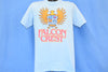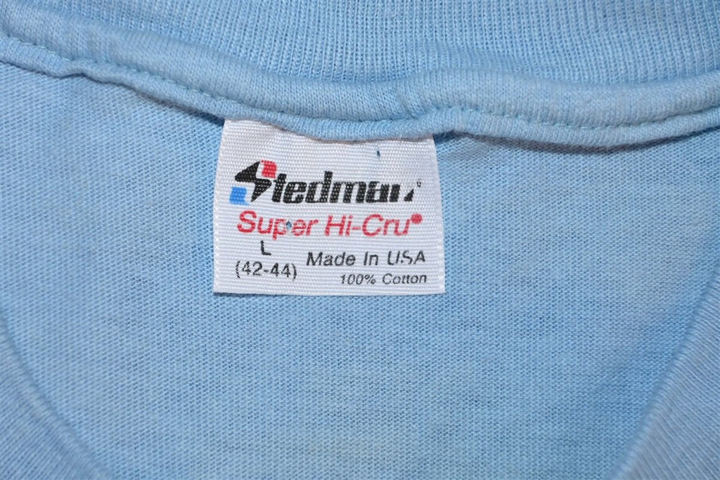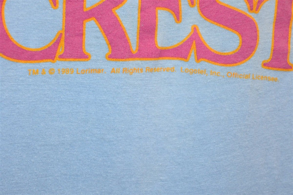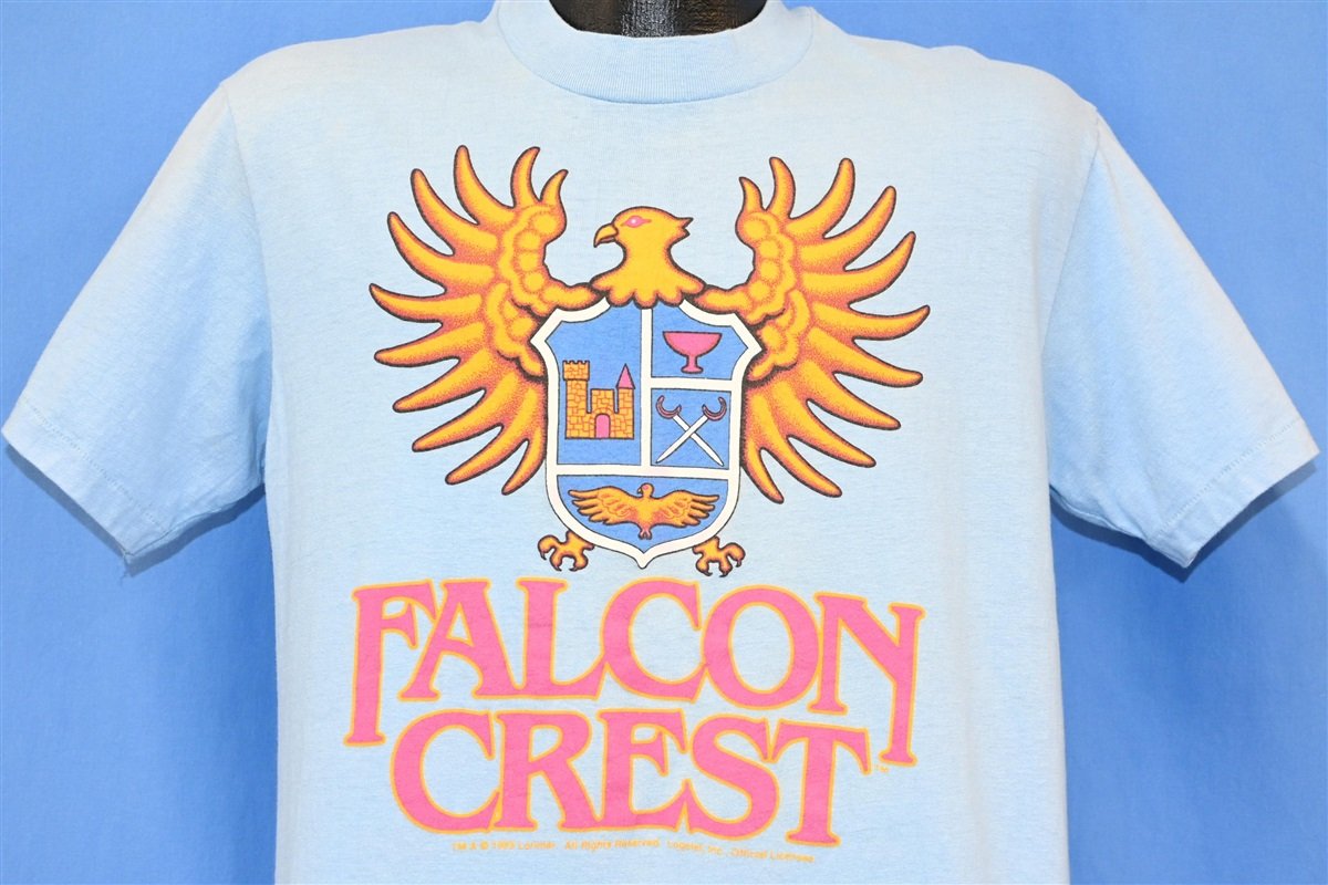This cool shirt was made to promote the show Falcon Crest, a CBS soap opera that ran for nine seasons during the 80s. Falcon Crest centered around the feuding family members that owned the fictitious Falcon Crest Vineyards in California. The series kicked off with the death of Jason Gioberti and the subsequent clash between his sister Angela Channing and son Chase Gioberti as they battled for control over the winery. The show was created by Earl Hamner Jr. who was also responsible for the long-running series The Waltons, and the show earned Jane Wyman a Golden Globe for her portrayal of Angela Channing.