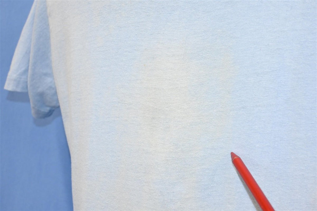 Fits like a modern unisex adult large. There is light discoloration on the graphic and screen burn on the back, see pics.