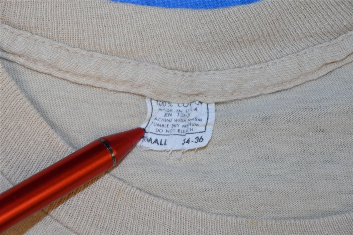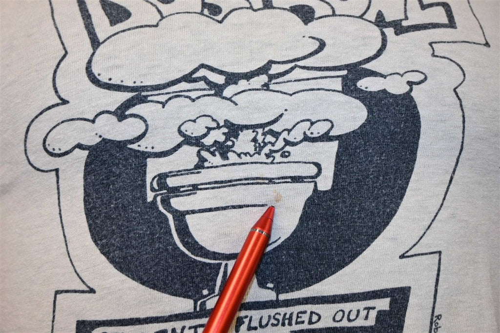 This cheeky shirt is a remnant from the 1980 Amherst Massachusetts Water Shortage. During the region's worst drought since 1965, the University of Massachusetts, or UMass, was forced to cease operations for several days. Classes were put on hold from September 4th until the 8th, and on the morning of the 4th all students were asked to evacuate the campus. The few students who remained in the area turned to partying, and they had plenty to drink despite the lack of water, as liquor store sales rocketed. This shirt commemorates the events of those three days with a comical image of a toilet and the words "The Great UMass Dust Bowl Students Flushed Out of Dorms".