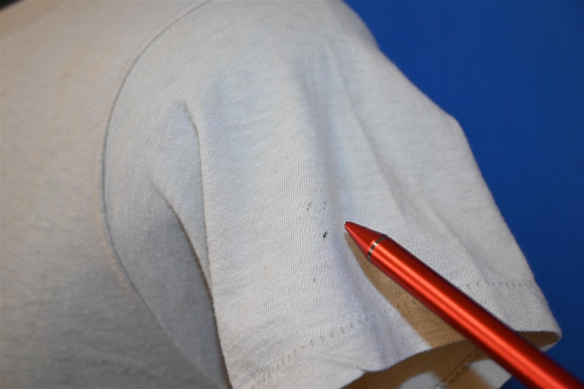 Fits like a modern unisex adult small. There are spots on the front and left sleeve when wearing, see pics.