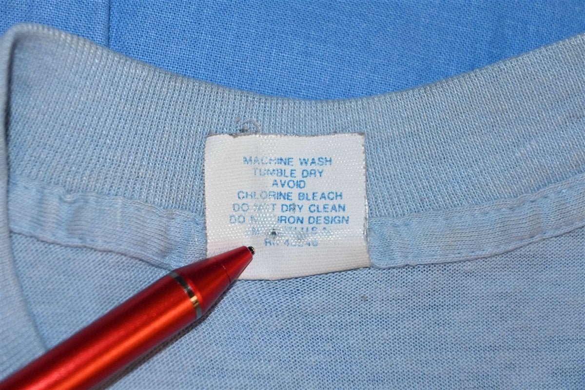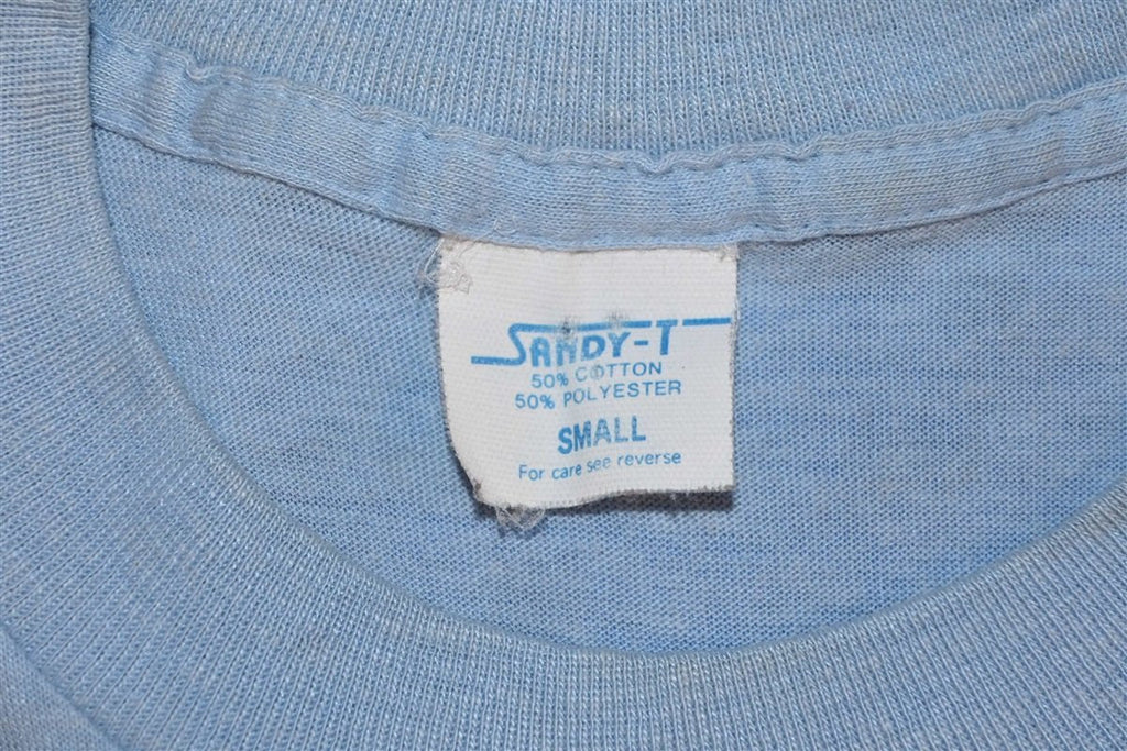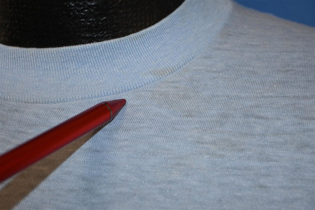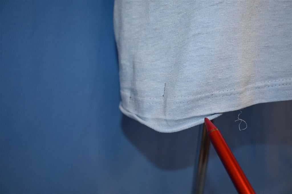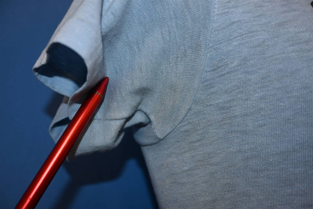 Fits like a modern unisex adult small. There is a busted seam along the bottom and discoloration in the underarms and near the collar, see pics.