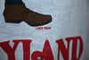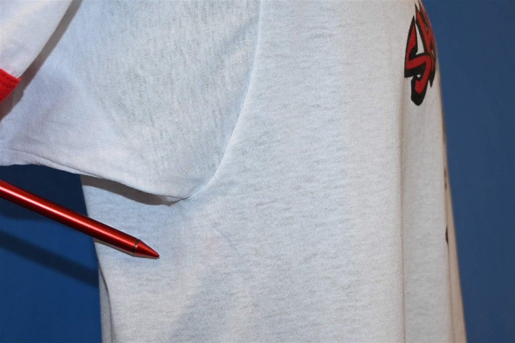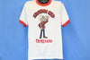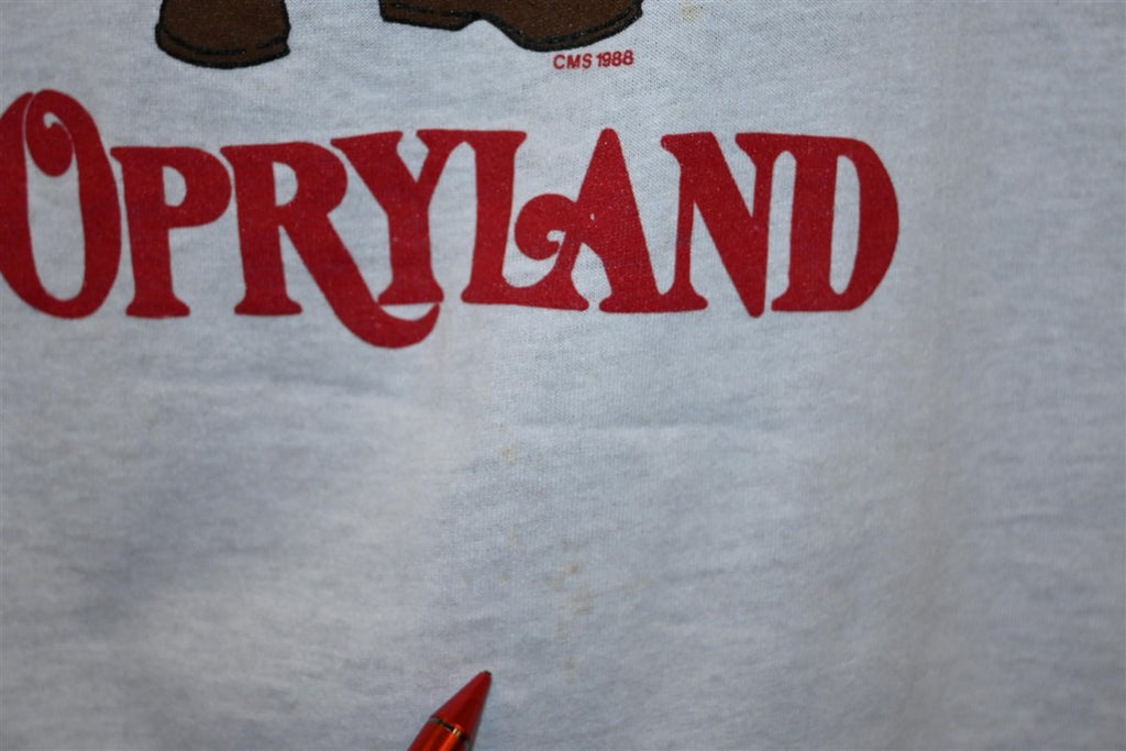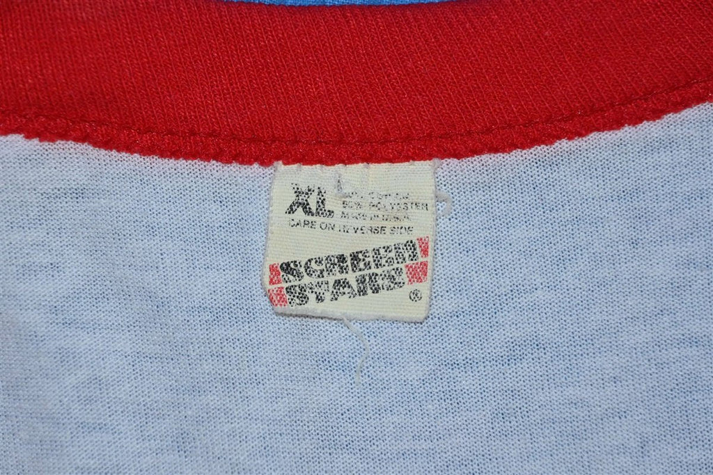 This sweet vintage ringer looks to be a souvenir from the now defunct theme park, Opryland USA in Nashville, Tennessee. This shirt showcases a local Nashville icon, Shotgun Red. This delightful character used to be the co-host of the talk show Nashville Now, which aired on TNN in the 80s and 90s. Shotgun Red was a beloved puppet portrayed by the musician and comedian Steve Hall, who originally purchased the puppet at a hobby shop in Minnesota back in 1980.