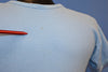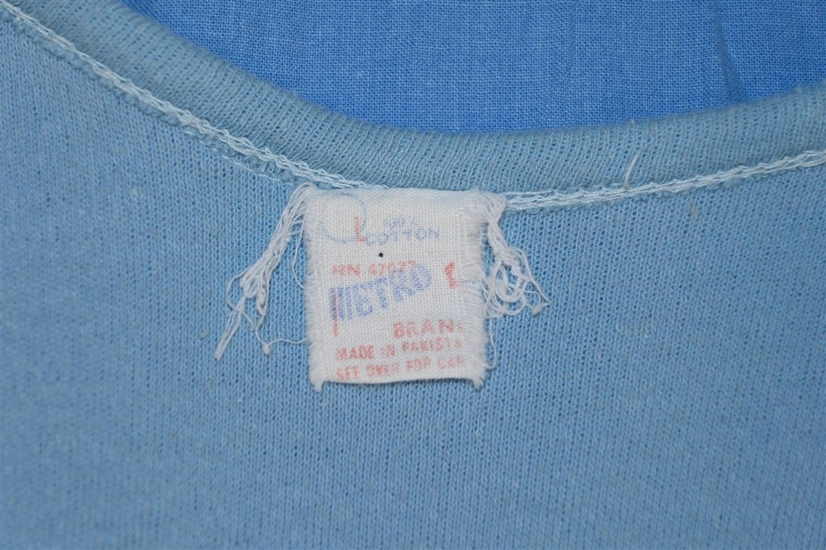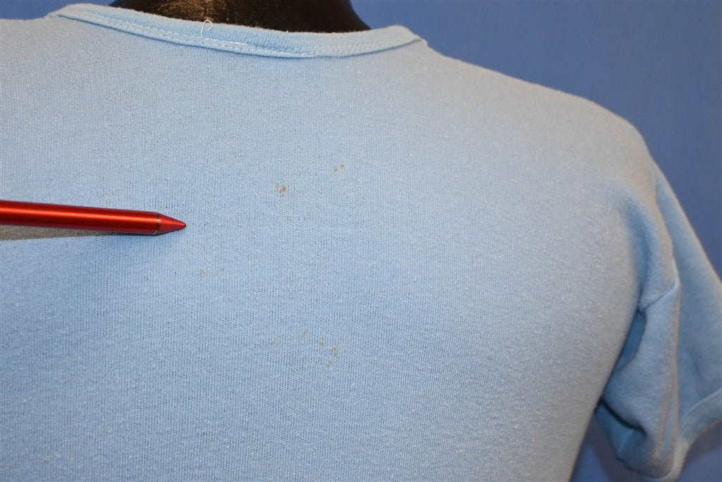 The tag says large but this shirt fits like a modern unisex adult medium. This shirt is rib knit and stretchy. There are some small spots, see pics.