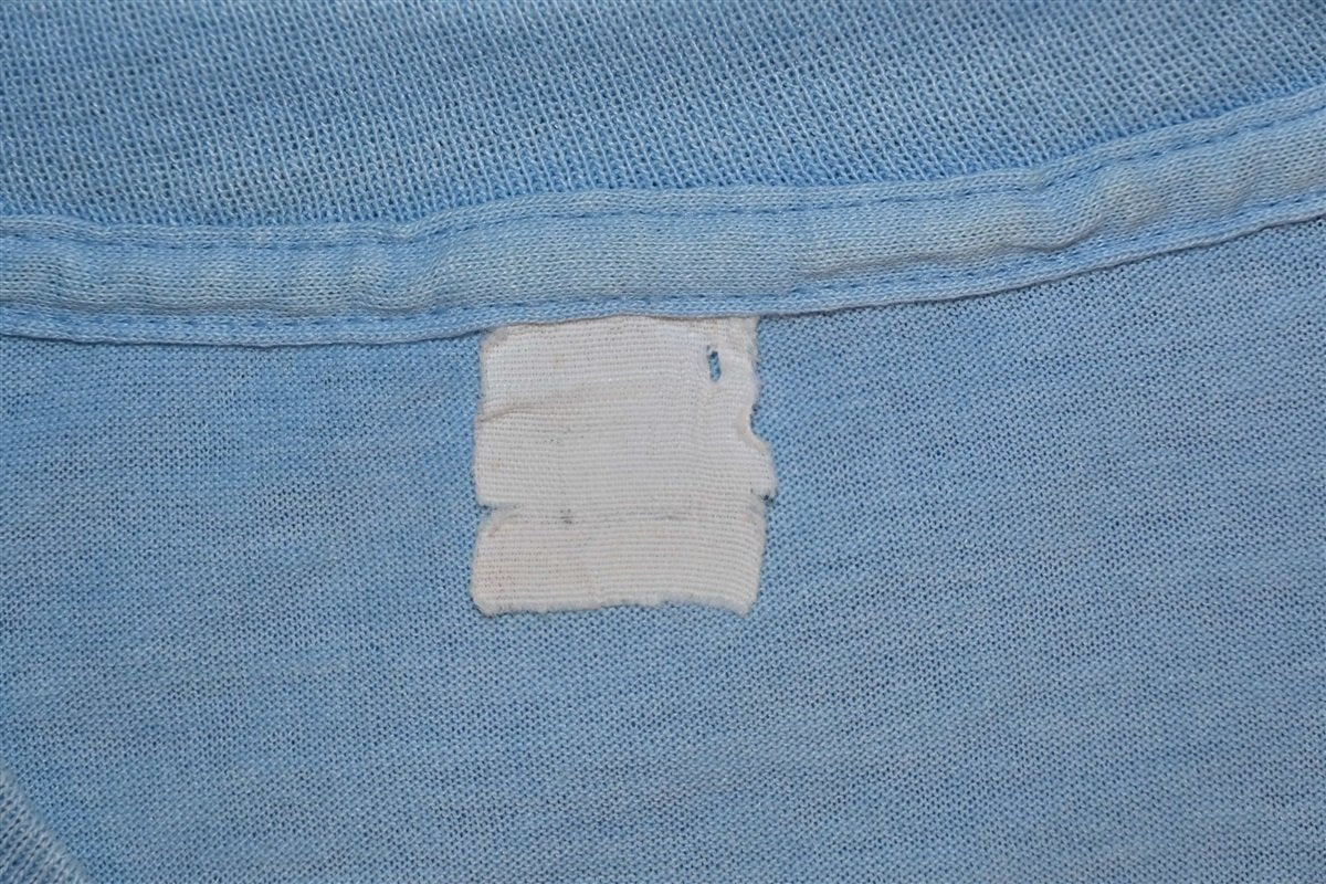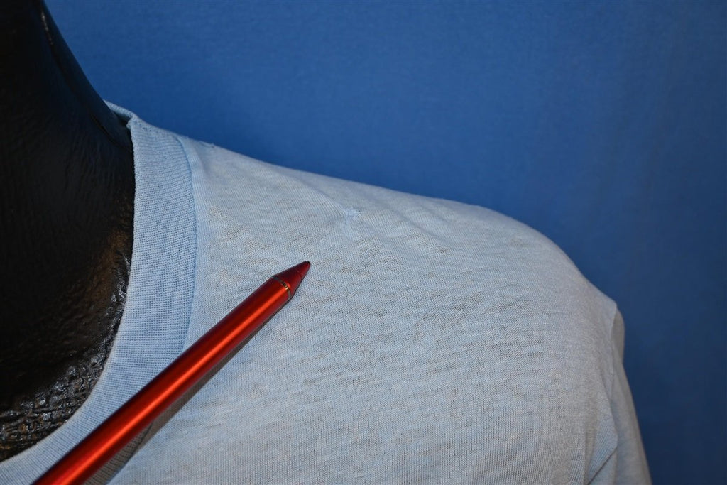 Fits like a modern unisex adult large. This shirt is soft and thin with some small spots and repair on the shoulder, see pics.