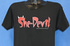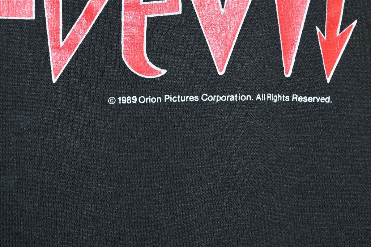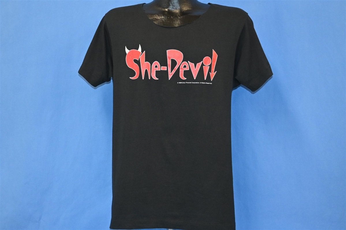 This cool shirt promotes the 1989 black comedy She-Devil, which starred Meryl Streep opposite Ed Begley jr. and Roseanne Barr. The movie portrayed a loose adaptation of the Fay Weldon novel, The Life and Loves of a She-Devil, and it centered around a housewife getting revenge on her ex-husband and his new lover.
