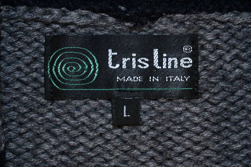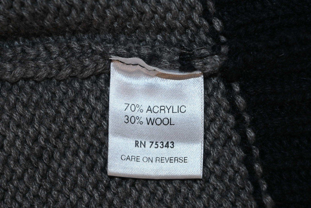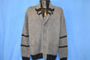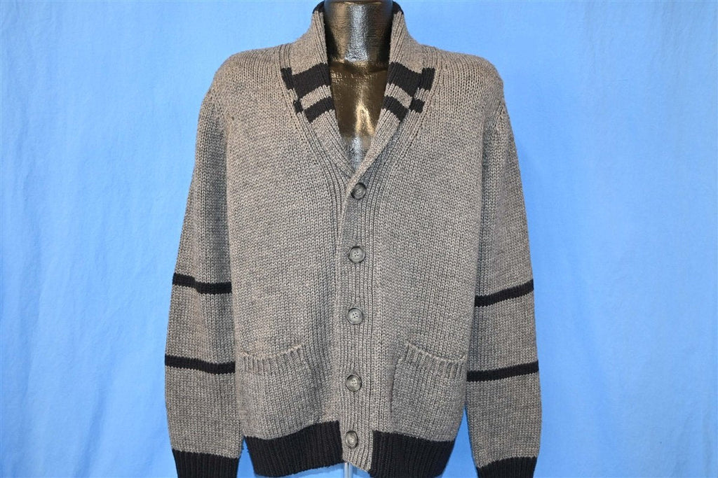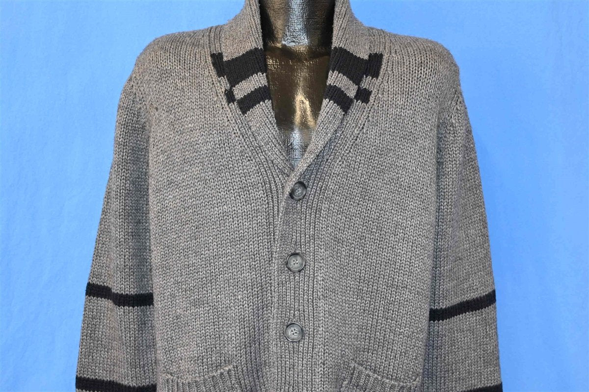 This stylish vintage cardigan was made in Italy during the 90s. It comes in a handsome dark charcoal gray, and is made from a cozy wool blended material. This sweater features two front pockets, button closures, and a shawl neck style collar. The cardigan also includes a simple, black striped design along the sleeves, neck, and bottom.