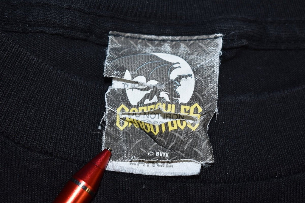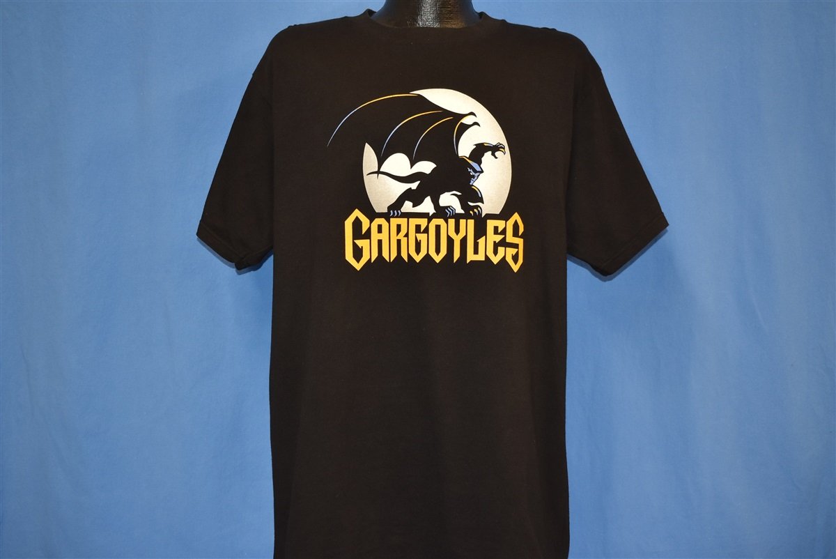 This awesome vintage shirt is for the animated television series Gargoyles that was produced by Walt Disney Television Animation. The front of the shirt shows off the logo for the series while the back includes the tag line "The night will never be the same". The series centered around a group of enchanted gargoyles residing in New York City. During the day they were simple petrified statues, while at night they came to life to protect the city. The series was notable for its distinctly dark tone and complex story arcs that set it apart from most other animated shows. Story lines for the series also drew inspiration from Shakespeare, particularly MacBeth and A Midsummer's Night's Dream, as well as medieval Scottish history.