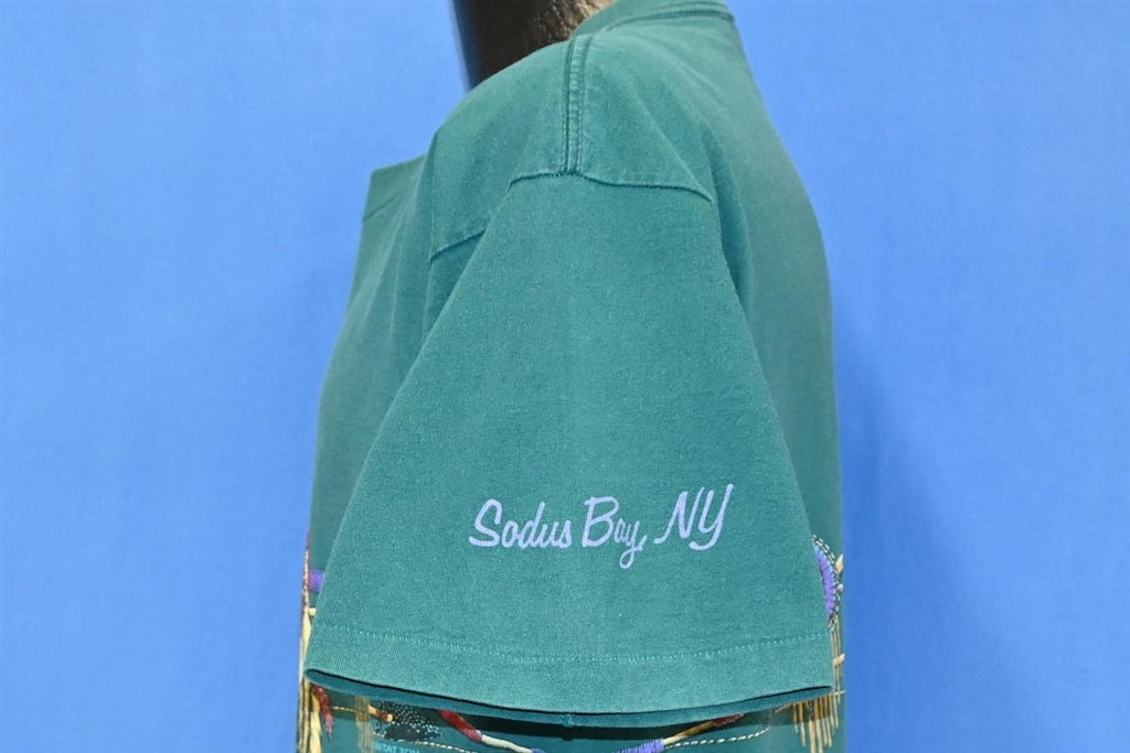 This cool vintage t-shirt is a keepsake from a trip to Sodus Bay, New York. It features a Native American-inspired graphic of a dreamcatcher on the front and back. Sodus Bay is on the American side of Lake Ontario, in the Finger Lakes region. The bay is one of the largest on Lake Ontario and it's an important port for shipping across the lake. Sodus Bay is also a popular destination for locals to go swimming and boating.