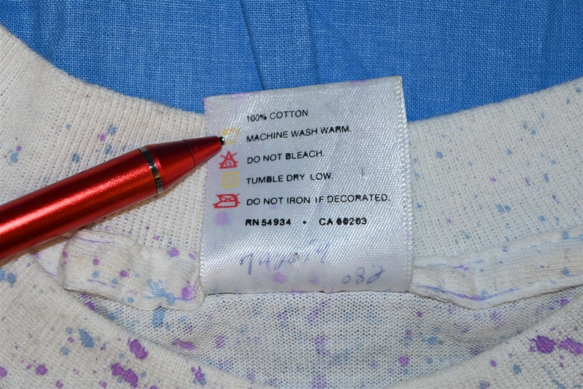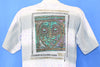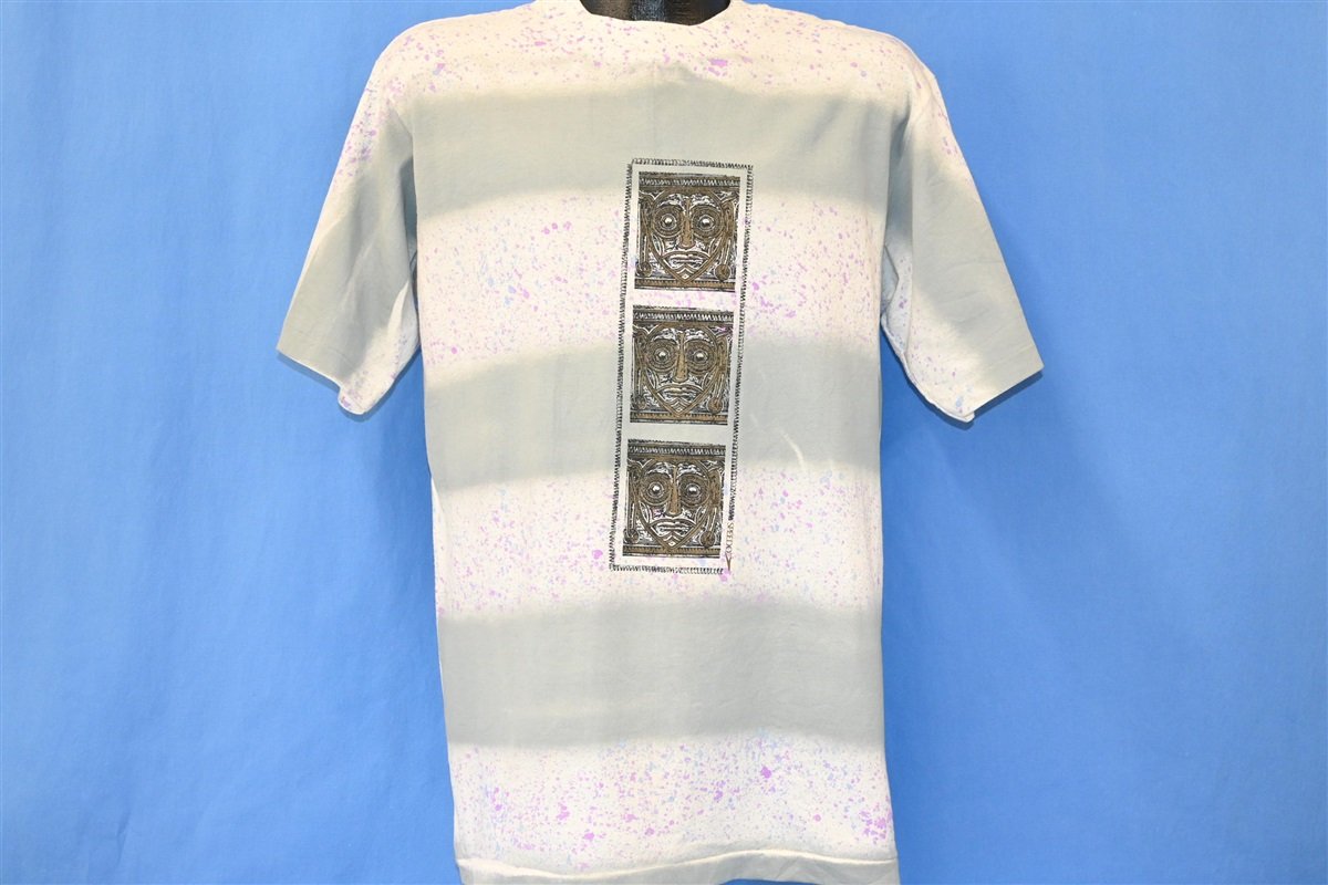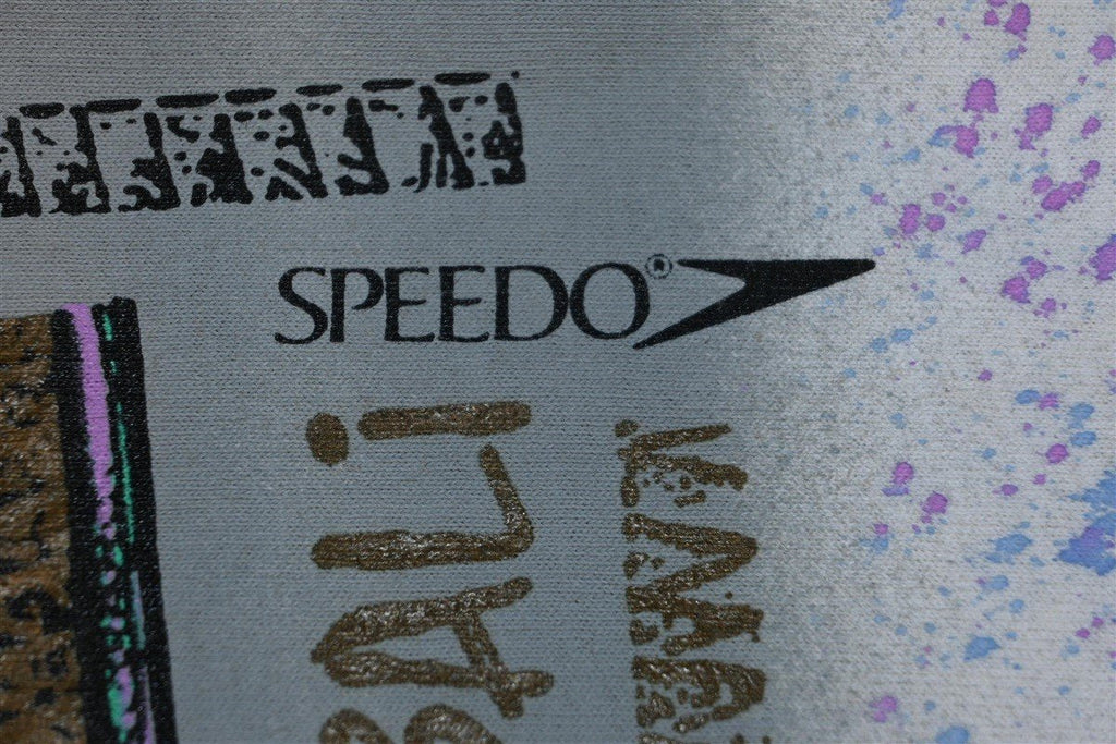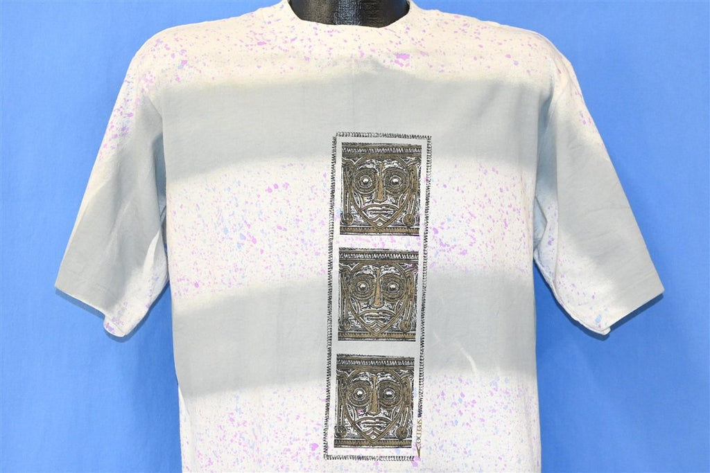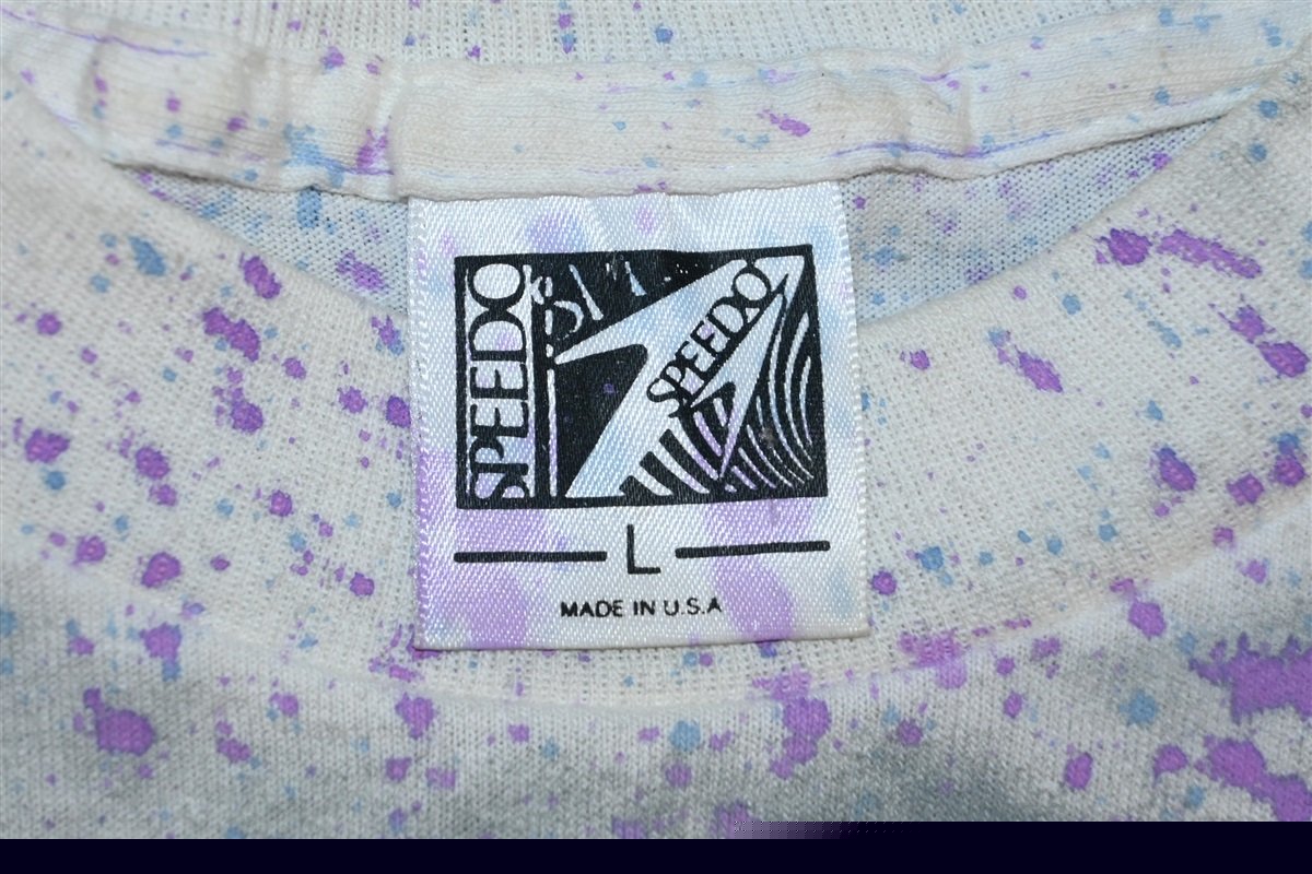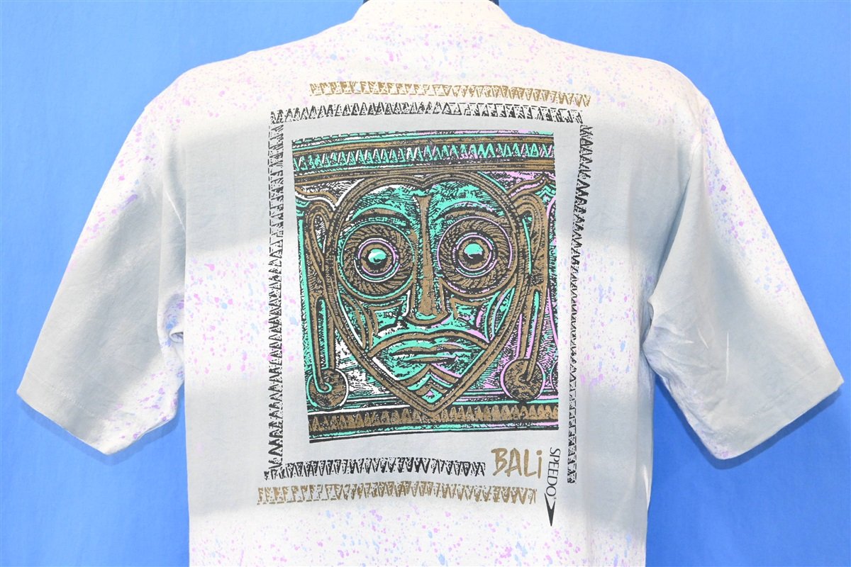 This awesome tee was made in the 90s by the innovative swimwear brand Speedo. The shirt has a cool all over print design featuring stripes, colorful speckles, and double-sided graphics. The shirt pays tribute to the Indonesian province of Bali with some graphics inspired by Balinese masks and wood carvings.