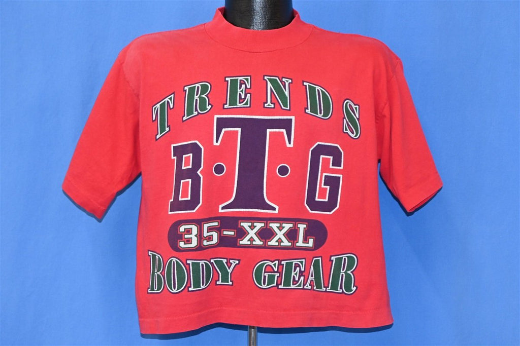 This rad half shirt features a graphic that says, "Trends Body Gear BTG 35-XXL." Trends is the brand that manufactured this shirt and Body Gear may be their line of work out clothes. Half shirts like this were popular fitness attire during the 80s and 90s.
