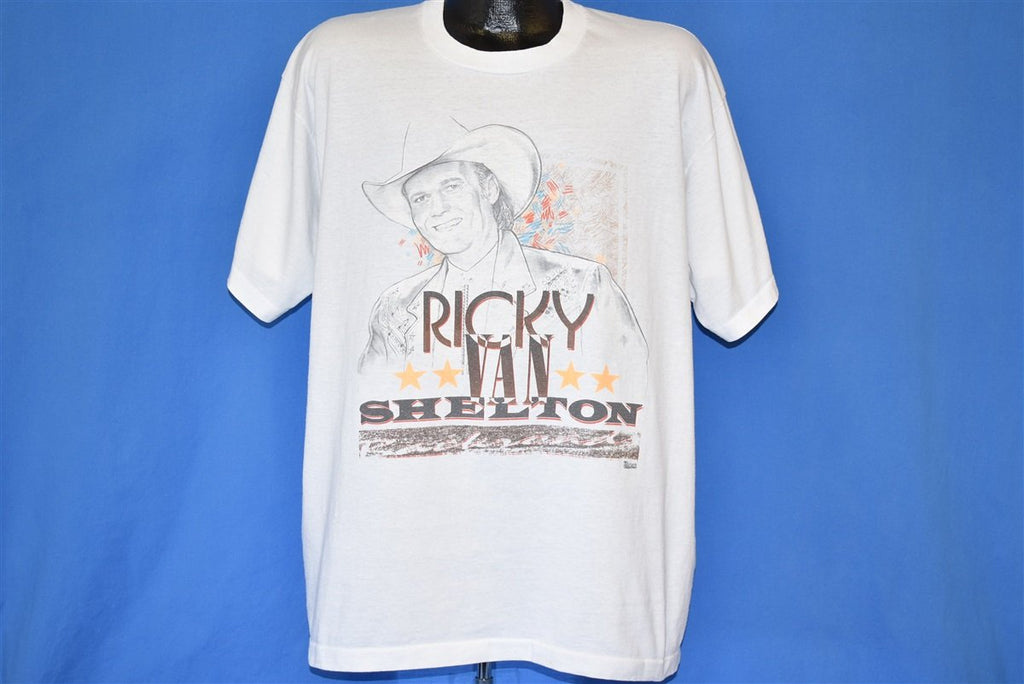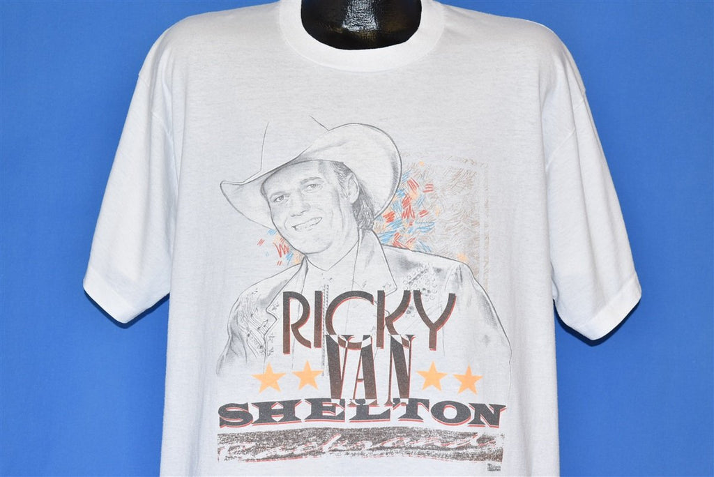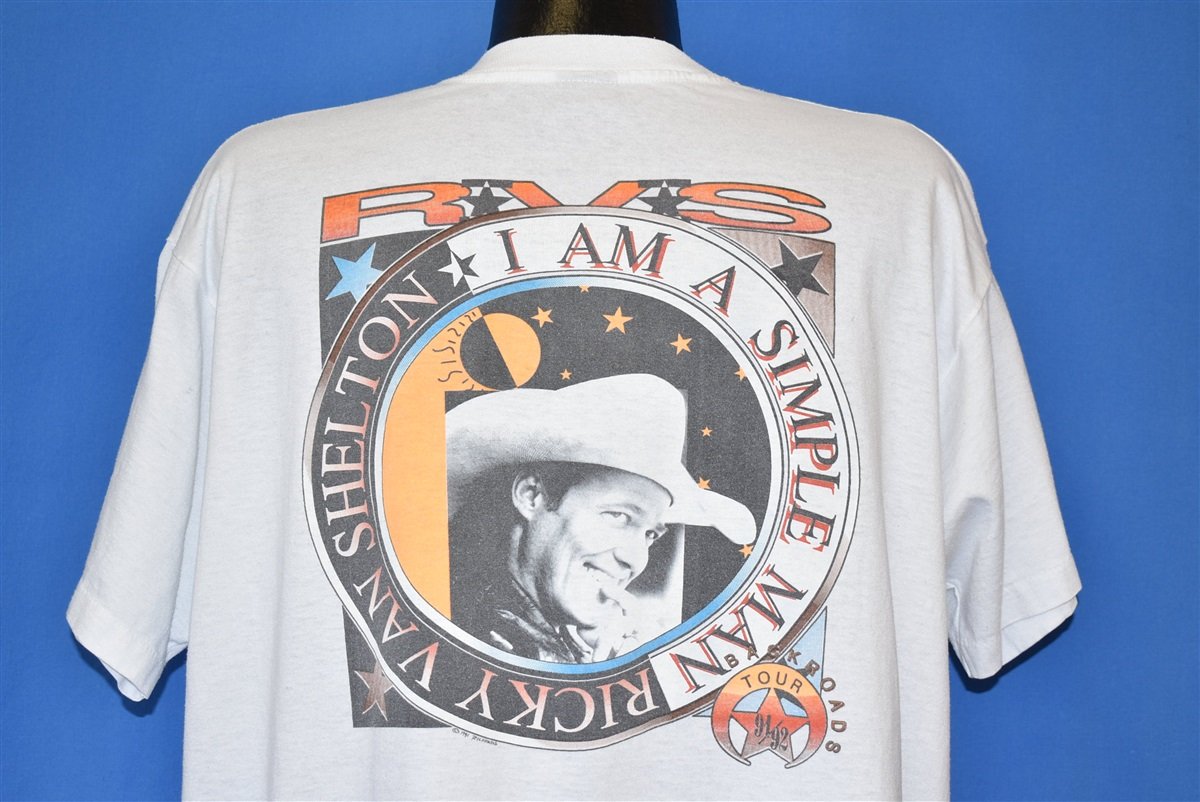 This vintage concert t-shirt is for country music star Ricky van Shelton for his 1991-1992 I Am a Simple Man Tour. "I Am a Simple Man" is the title of the first single off of Shelton's fifth studio album Backroads. The album also included the singles "Keep it Between the Lines" and "Rockin' Years" which was performed as a duet with Dolly Parton. "I Am a Simple Man" managed to be Shelton's 9th number 1 hit on the Billboard Hot Country Singles & Tracks chart.