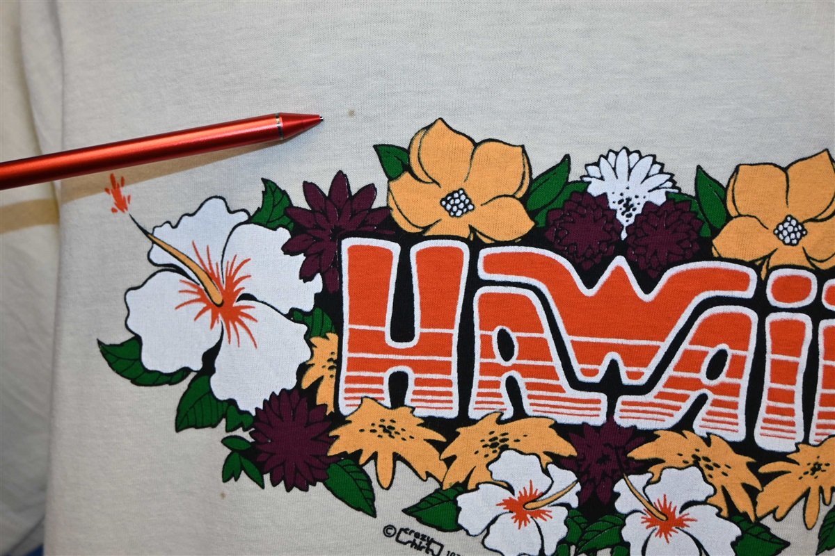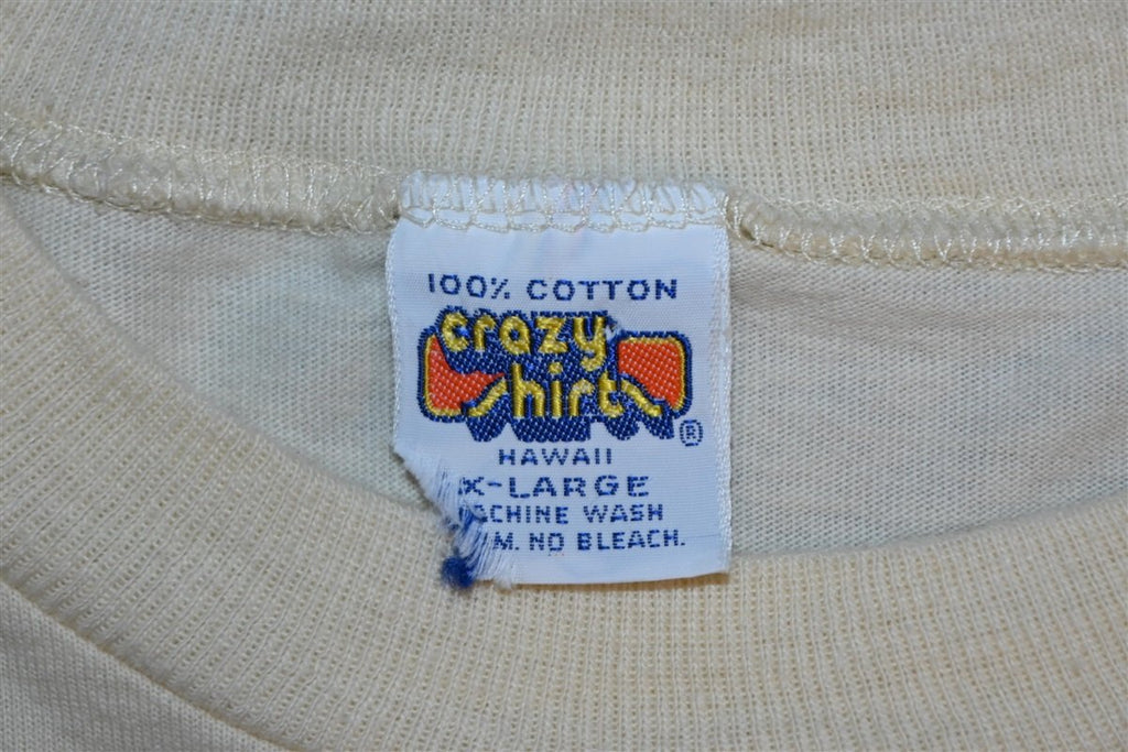 This awesome double-sided tee was made by the Hawaiian apparel company Crazy Shirts, which first began producing clothing in the 1960s. This shirt was made in the 70s, when the company was still fairly small compared to its future expansions. The company was created by Frederick Carlton "Rick" Ralston and it originally was called Rick's Crazy Shirts before the name was shortened.