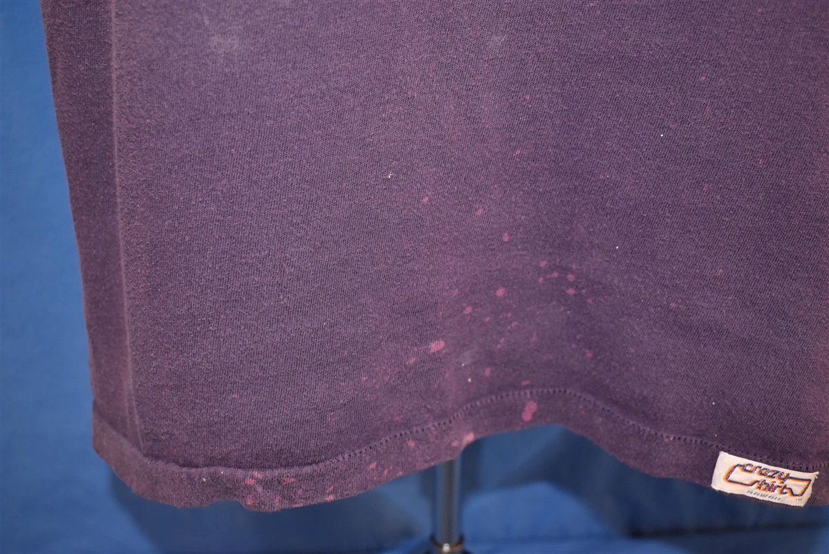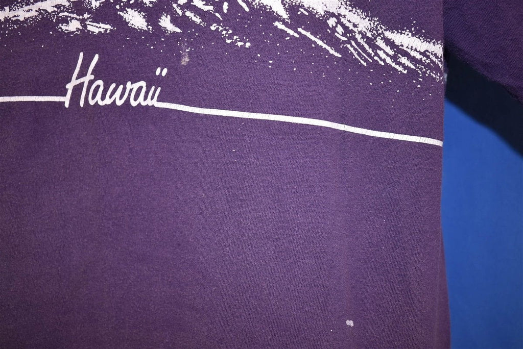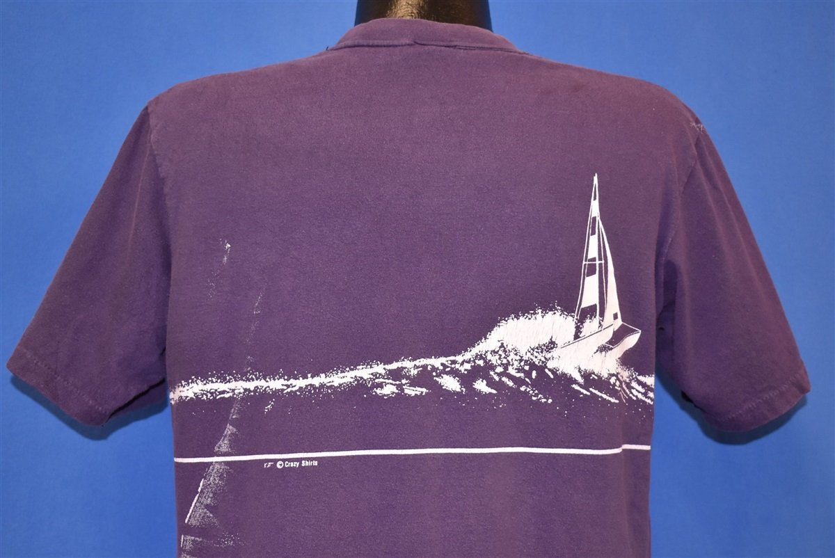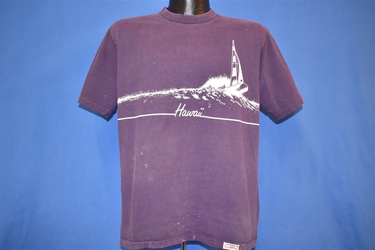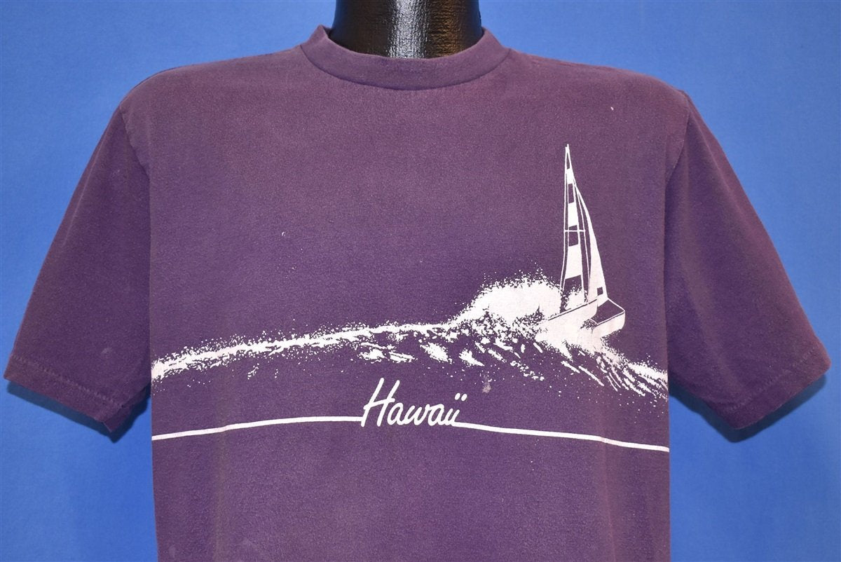 This 70s vintage tee highlights one of the many nautical wonders in Hawaii. The graphic shows a catamaran sailboat roughing it through some gnarly waves. The island state is beloved for its proximity to the ocean, providing great surf, lush tropical beaches, and exotic marine wildlife.