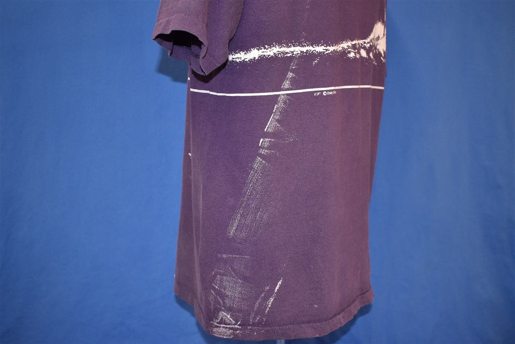 Fits like a modern unisex adult large. This tee is distressed with paint and bleach spots throughout, see pics.