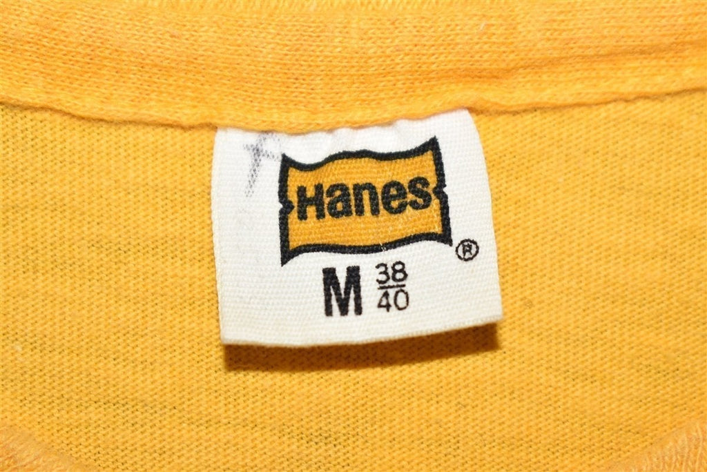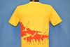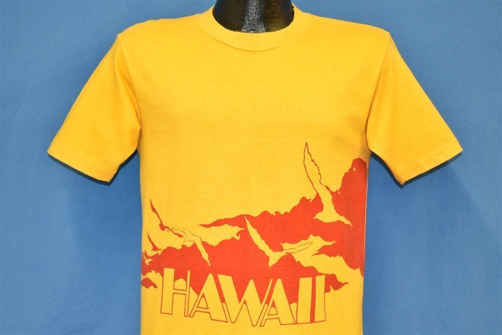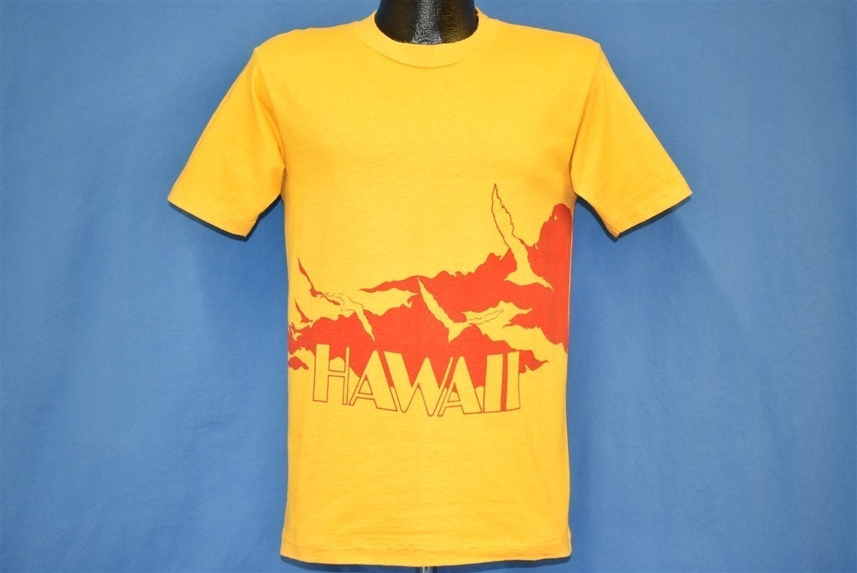 This 70s tee is all about the tropical paradise that is Hawaii. It comes in a rich yellow color with red graphics for a nice contrast. The imagery highlights the more natural and primitive side Hawaii, featuring a flock of birds flying amongst thick clouds. Hawaiian birds are plenty but the most common one include the House Finch, Mynah, and Nene.