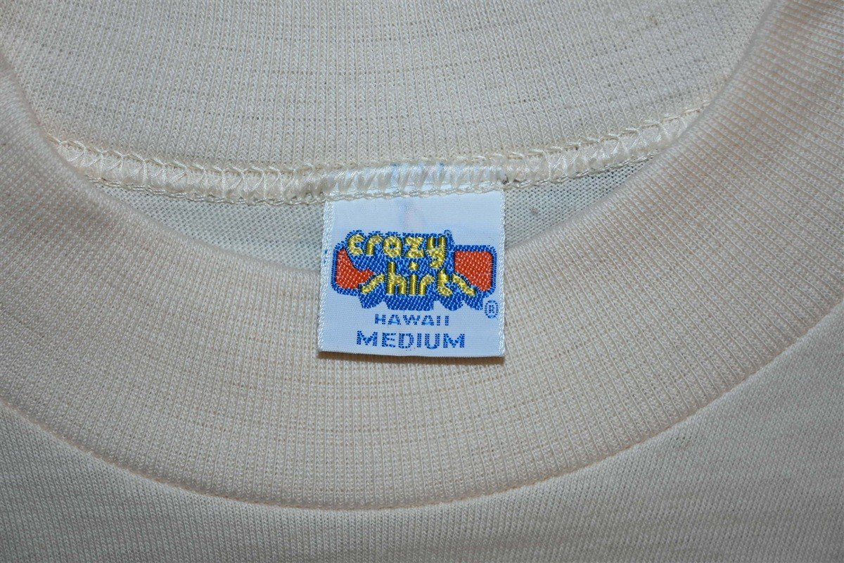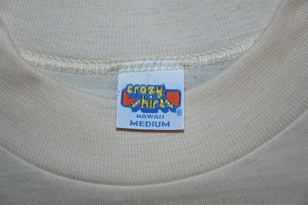 This sweet shirt promotes Crazy Shirts Hawaii. Crazy Shirts was founded by Rick Ralston in 1964. He became famous for being among some of the first people and companies to turn underwear into outerwear. He was titled as "the T-shirt king of America and the father of the modern T-shirt" by Reporter Sharon Nelton of BNET. In the 1970s, Crazy Shirts opened their second store and had 150 t-shirt designs, but over time their collection to more than 550 designs. The company has locations distributed over 15 cities in Hawaii, California, Colorado, Florida, and Nevada. Crazy Shirts has gained a cult following since their initial creation of the modern graphic tee.