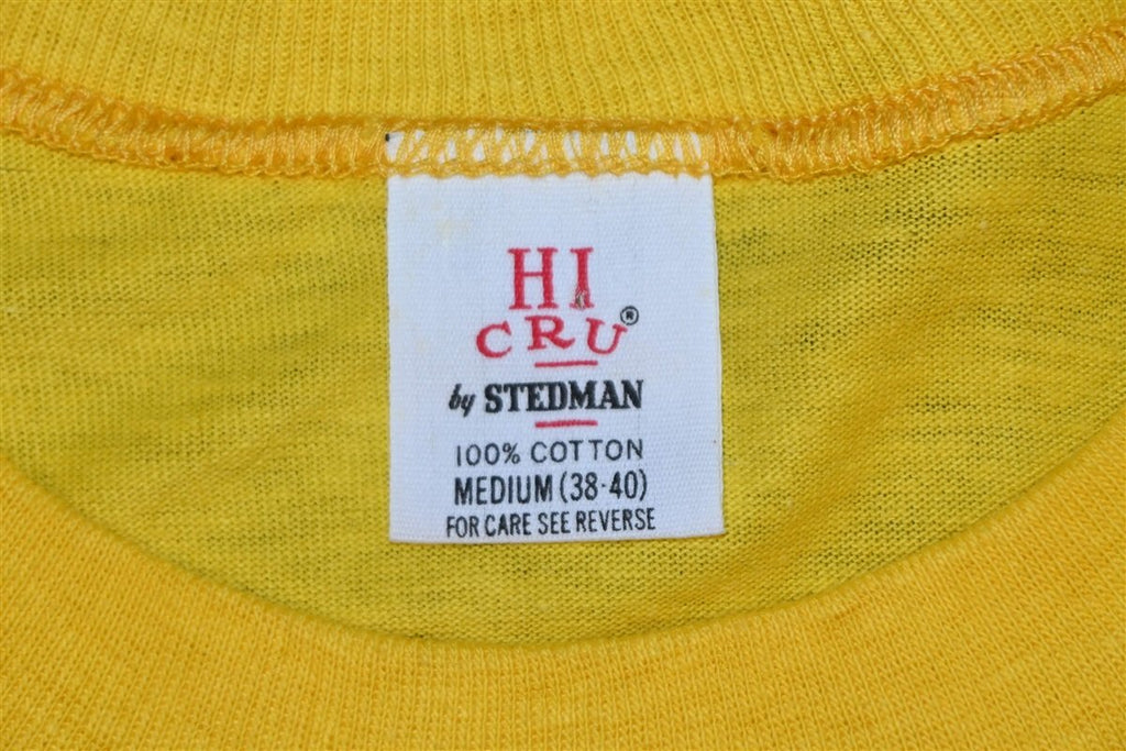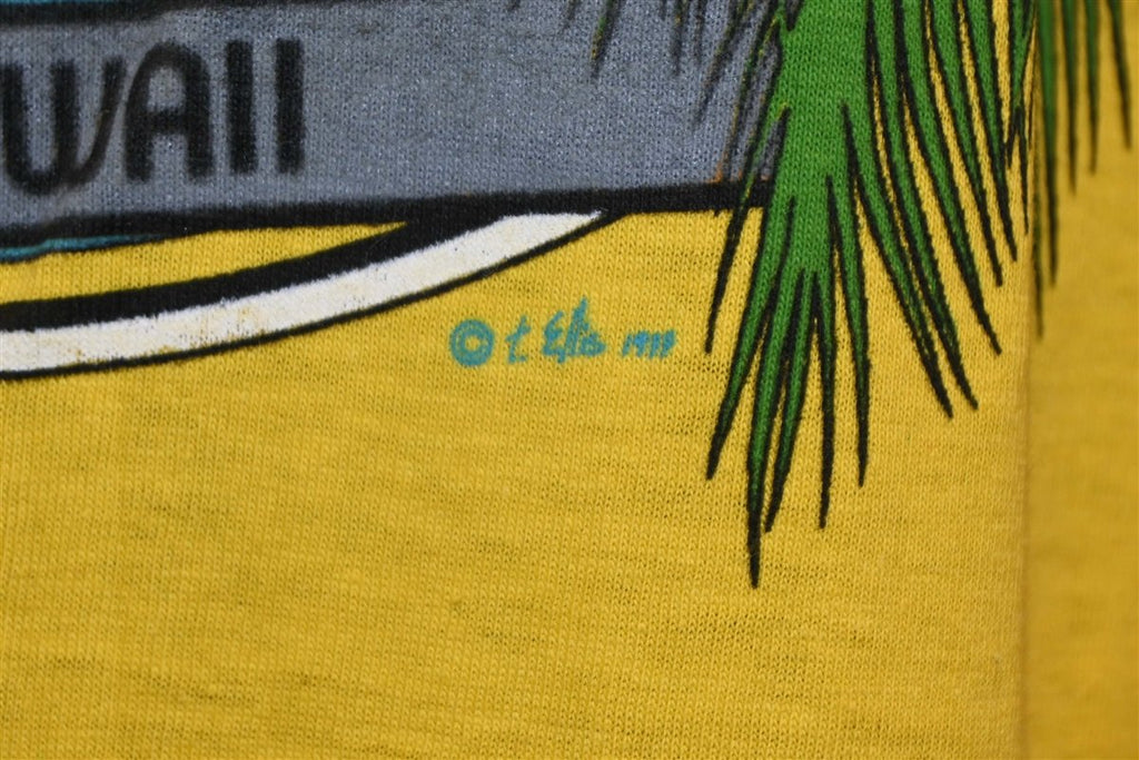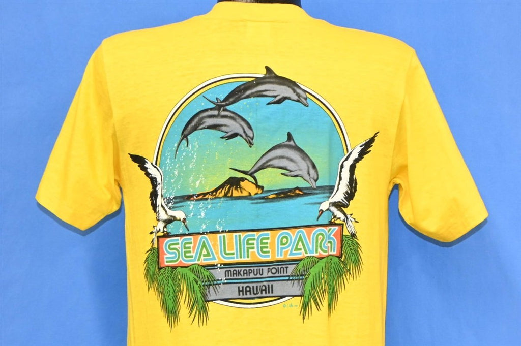 This awesome Polytees shirt is deadstock from the 1970s. Back in the day, Polytees used to be popular thanks to their vibrant t-shirt graphics, that showed off the tropical appeal of the Hawaiian islands. This double-sided tee was made to promote Sea Life Park, an aquarium found near Makapu'u Point on the island of Oahu. The park is also home to a bird sanctuary and several marine mammals. The large graphic on the back of this tee has a beautiful sunset image of some dolphins, which visitors can swim with at the park.