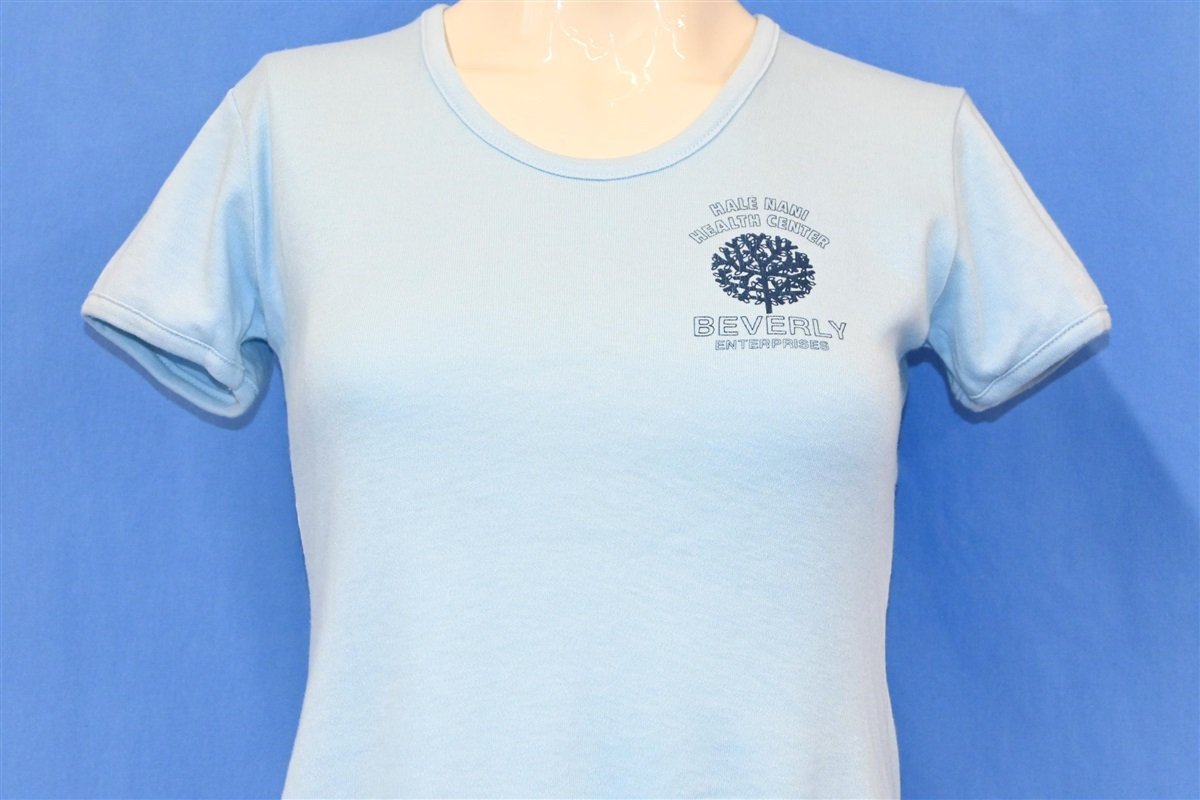 This awesomely soft tee promotes the Hale Nani Health Center located in Honolulu, Hawaii. This shirt dates back to the 80s, and during that decade the center was owned and operated by the nursing home chain, Beverly Enterprises.