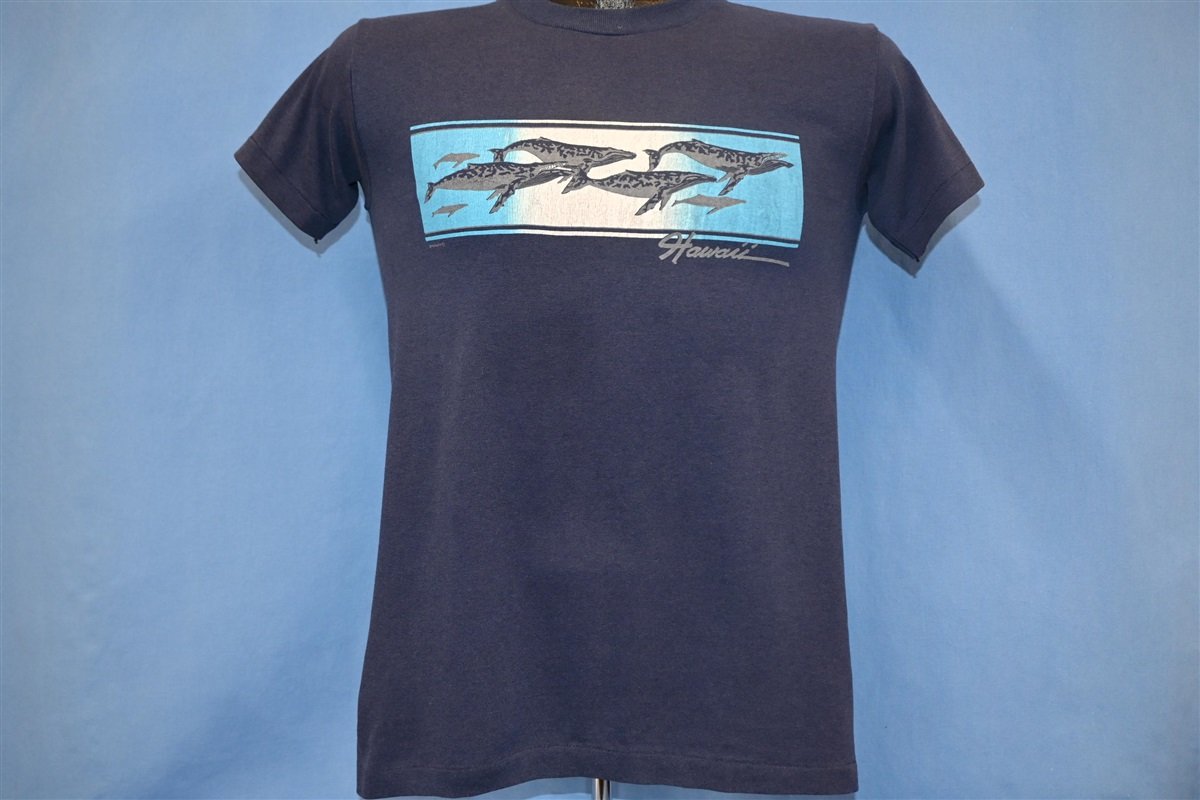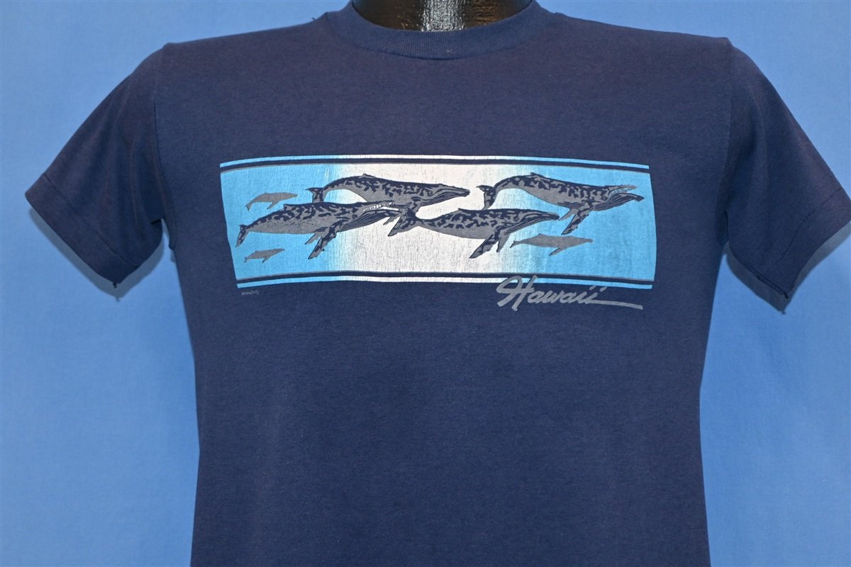 This awesome tee is a souvenir from Hawaii that features a graphic of a pod of humpback whales, happily swimming through the sea. It's not uncommon to see these majestic giants swimming off the shores of the Hawaiian Islands. The whales migrate to warm tropical waters during the winter months, and whale watching is a popular activity in Hawaii for both tourists and locals.