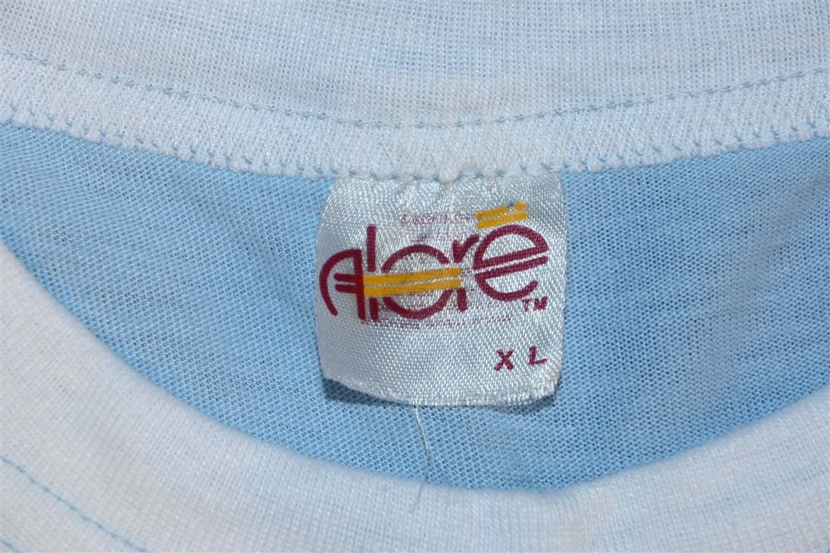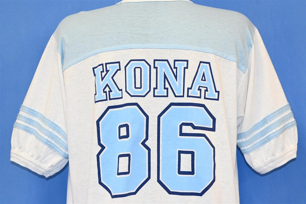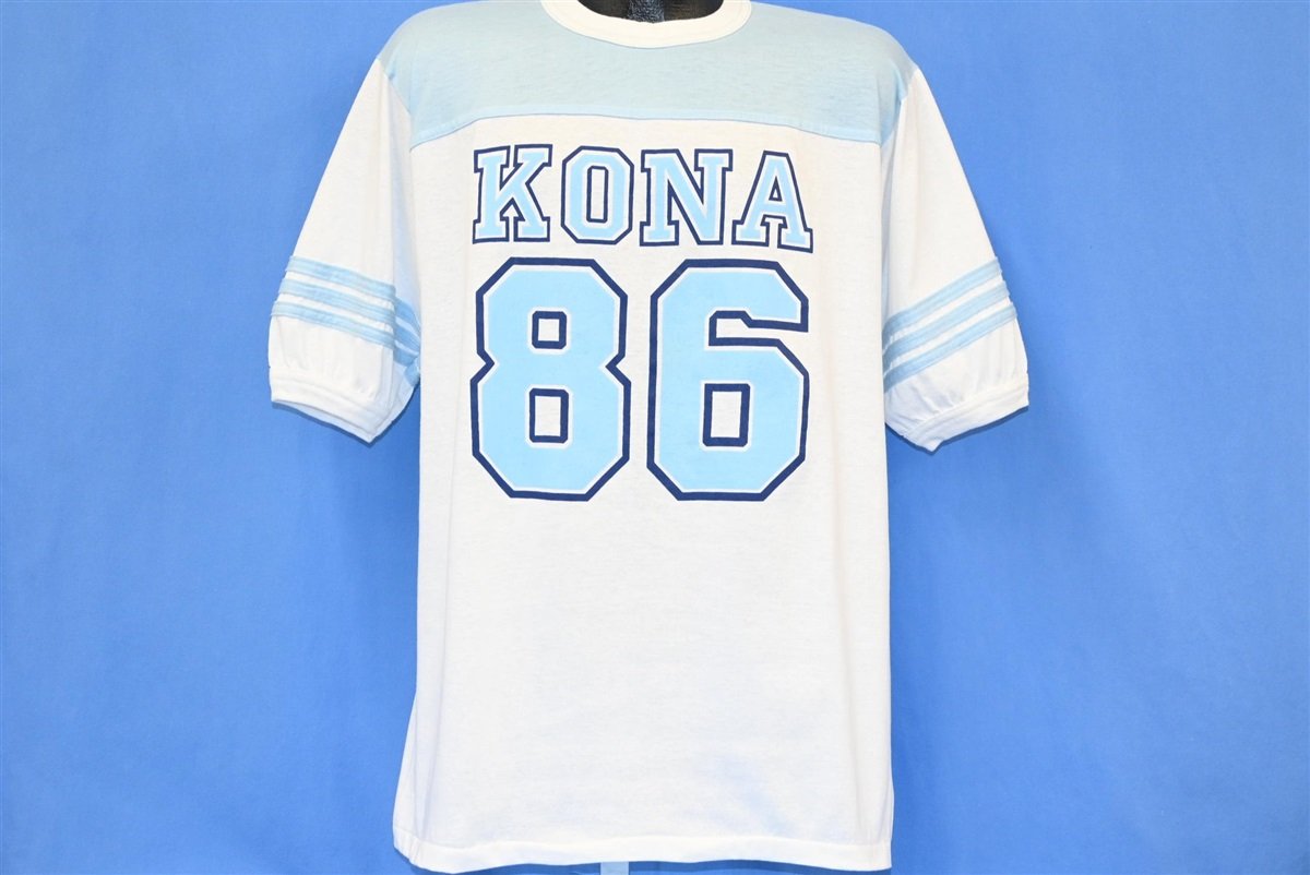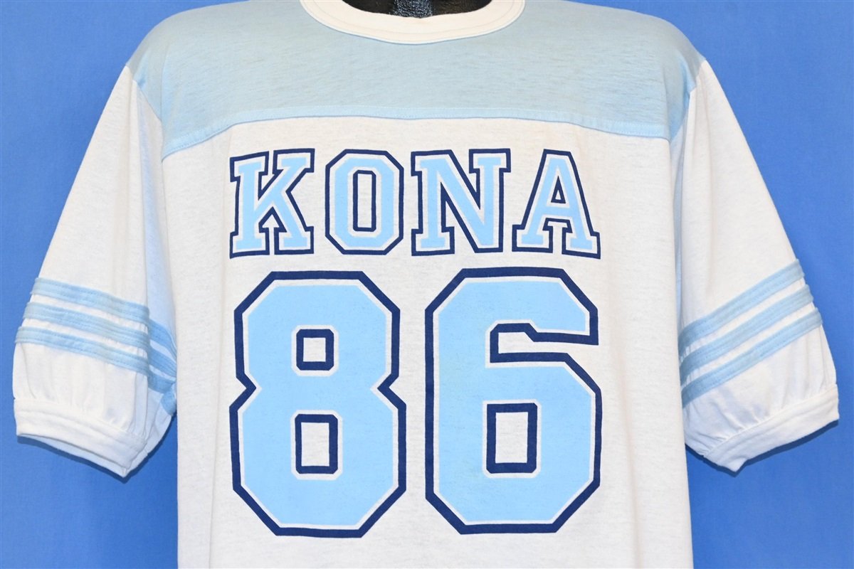 This cool jersey style tee is a sweet souvenir from a trip to Kailua-Kona located on Hawaii's eponymous "Big Island". This shirt commemorates the year 1986, with double-sided graphics and some stripes around the sleeves.