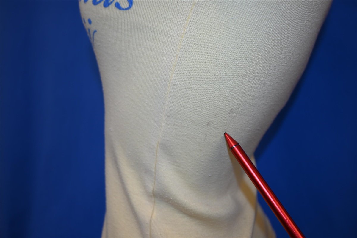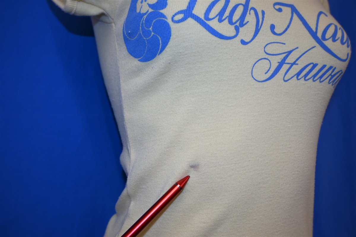 The tag says Misses Medium but this shirt fits like a modern women's adult extra small. There is a spot on the left side when wearing, see pics.