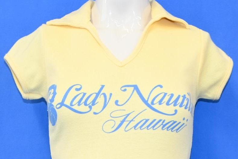 This stylish vintage polo was made in the 80s and it features a logo that says "Lady Nautilus Hawaii". There's not much information on what exactly Lady Nautilus was. It could have been a local event, an apparel brand, or another type of Hawaii-based company or manufacturer. The graphic next to the text shows a nautilus shell morphing into the silhouette of a woman. These shells belong to a species of cephalopods that are native to the Indo-Pacific region, where the Hawaiian islands land.