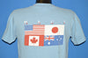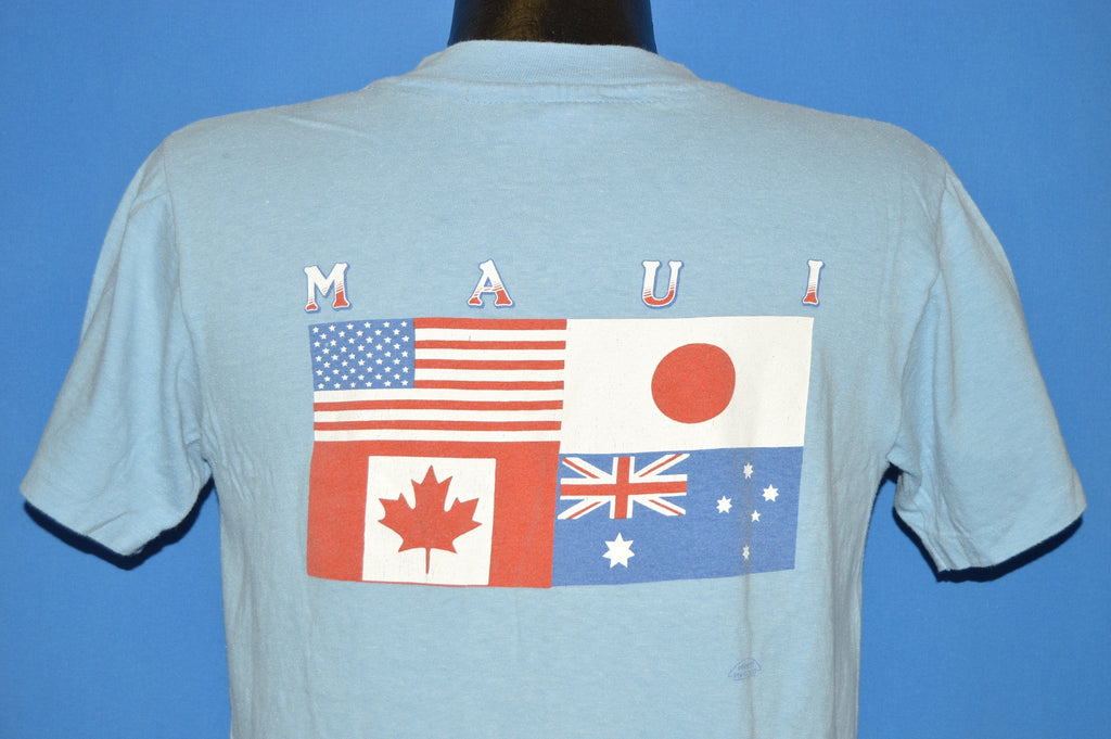 This blue tourist shirt has the Hawaiian flag on the front as well as the name "Maui", Hawaii's second largest island. On the back, there are images of the flags of four countries: the USA, Japan, Canada, and Australia.