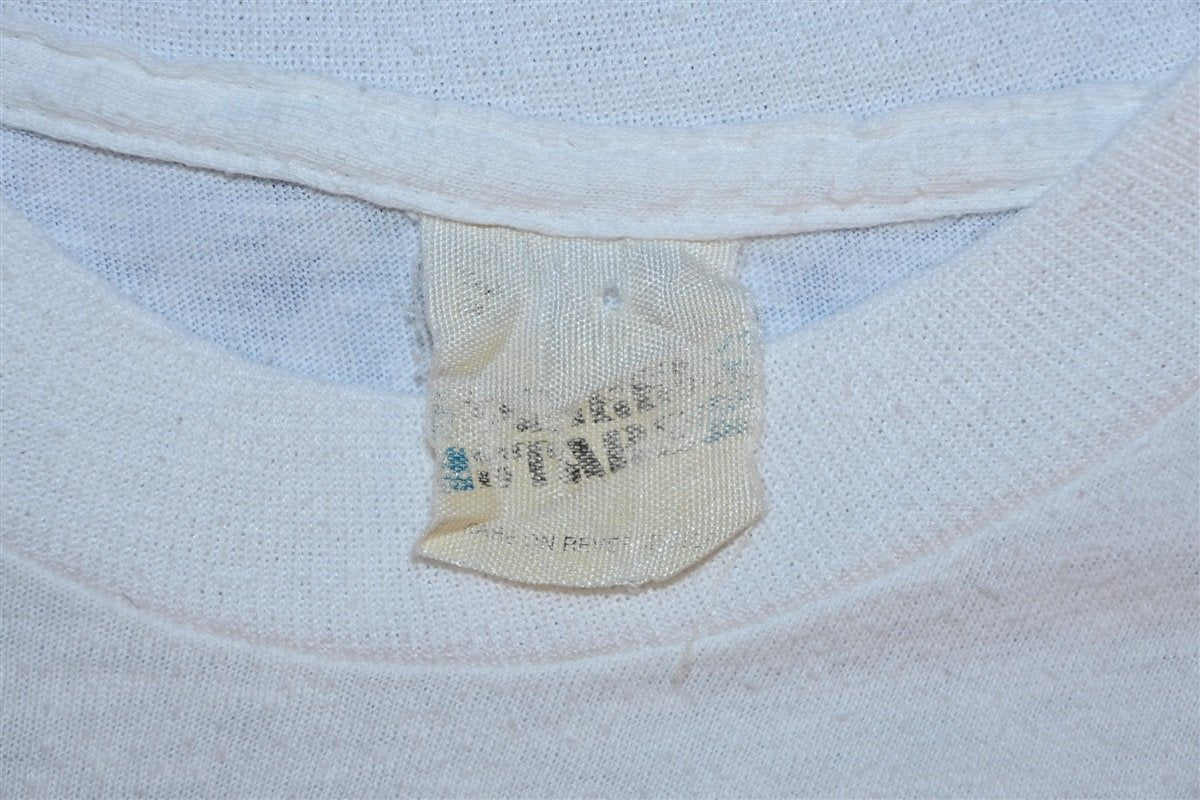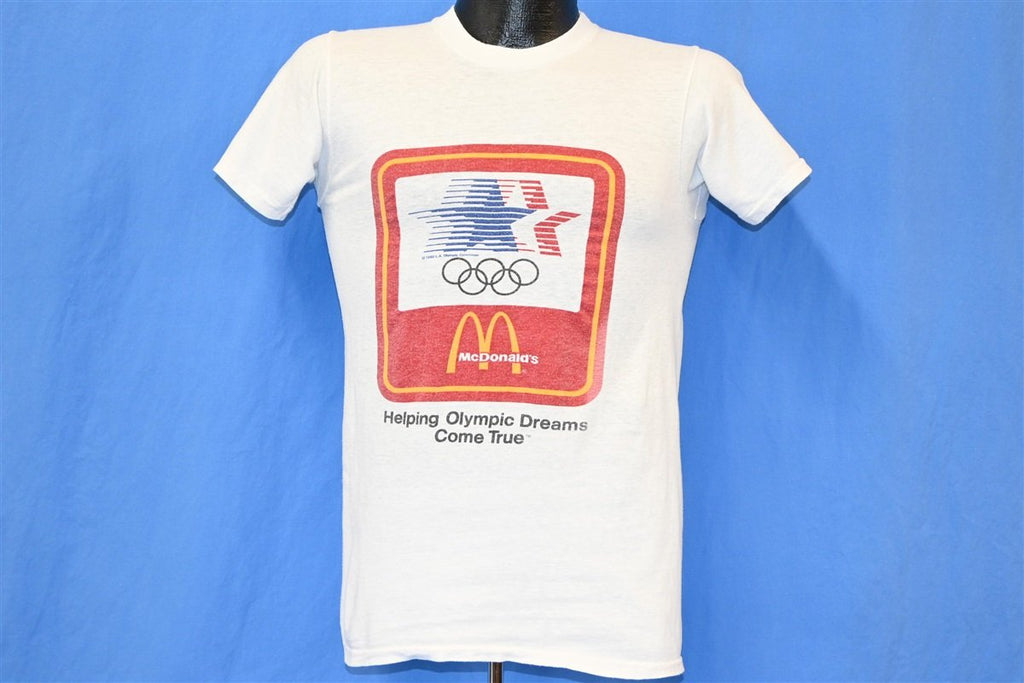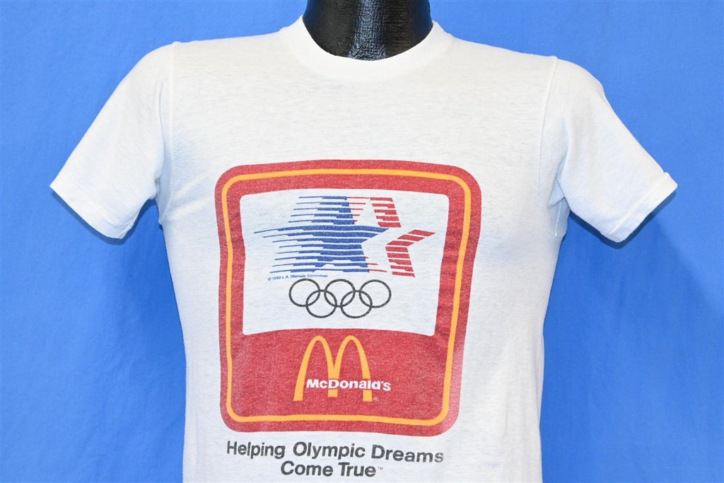 The front of this shirt includes an advertisement for McDonald's which says "Helping Olympic Dreams Come True". The shirt also includes the logo for the 1984 Olympics hosted in Los Angeles. McDonald's launched a giveaway in support of the '84 Olympics, which unfortunately lost the fast food chain more money than they anticipated when the Soviet Union chose to boycott the games. While this was bad for the company, McDonald's customers were delighted to cash in on some free food.
