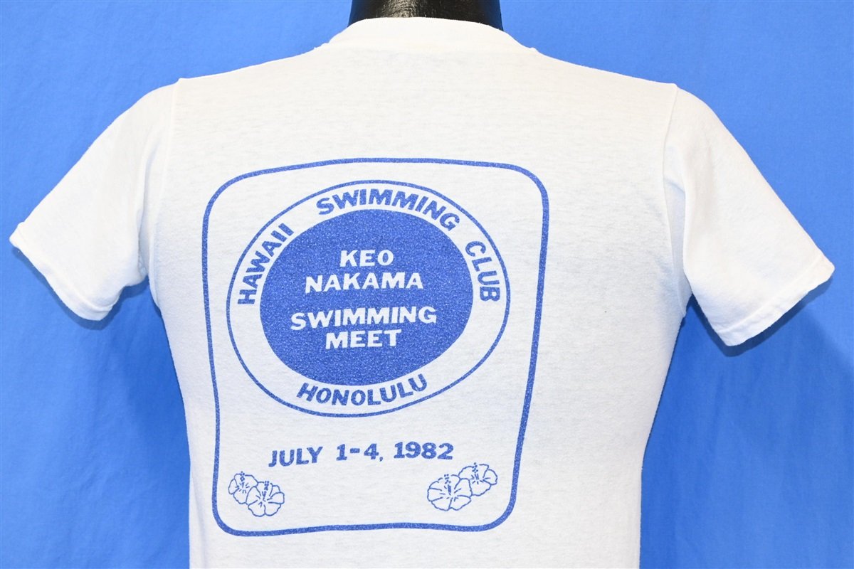 This double-sided tee was made back in 1982 to commemorate the 34th Annual Keo Nakama Invitational, which was sponsored by the Hawaii Swimming Club. This was a youth swimming competition for USA Swimming registered athletes. The competition was named in honor of the International Swimming Hall of Fame athlete, Keo Nakama, who was born in Pu'unene, Hawaii back in 1920. Unfortunately World War II prevented this talented swimmer from ever competing in the Olympic Games, but his legacy lives on to inspire young athletes.