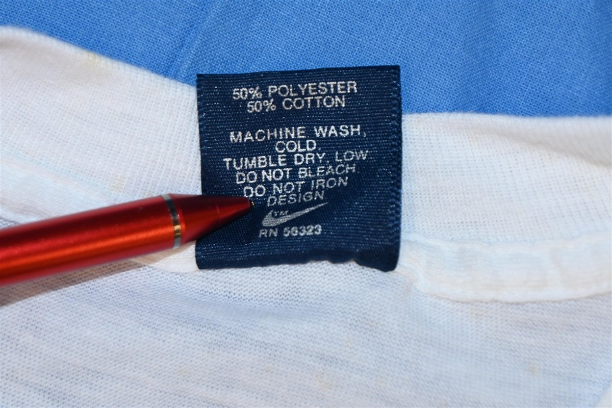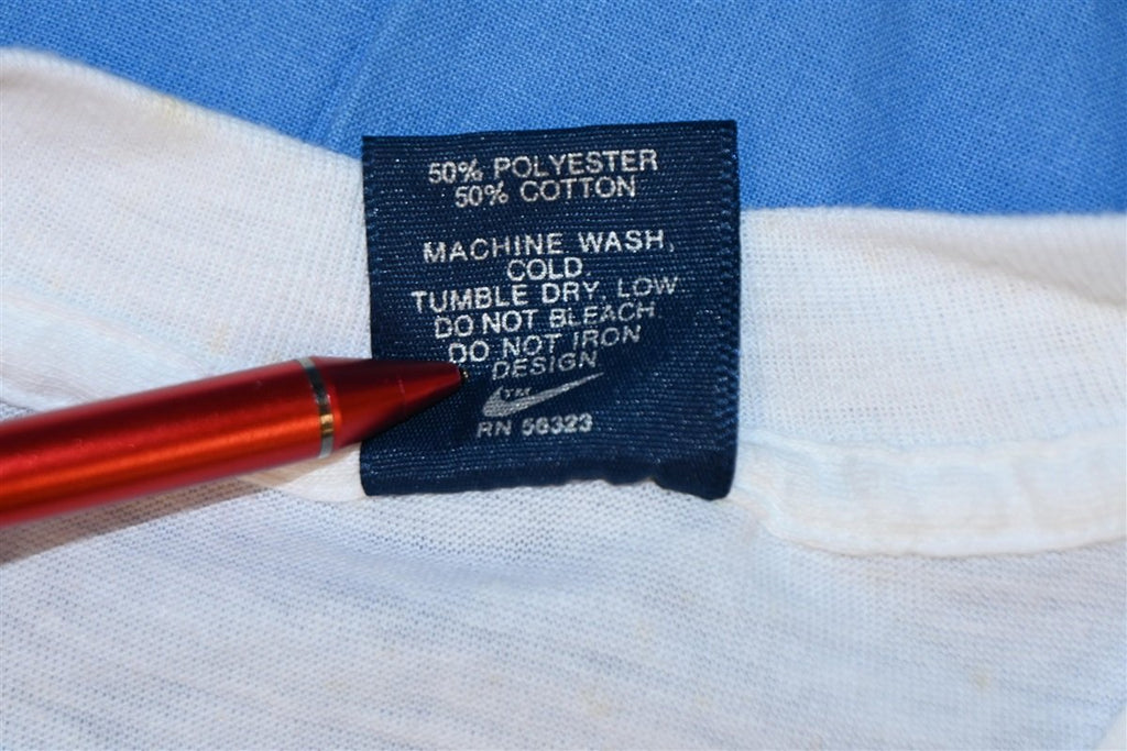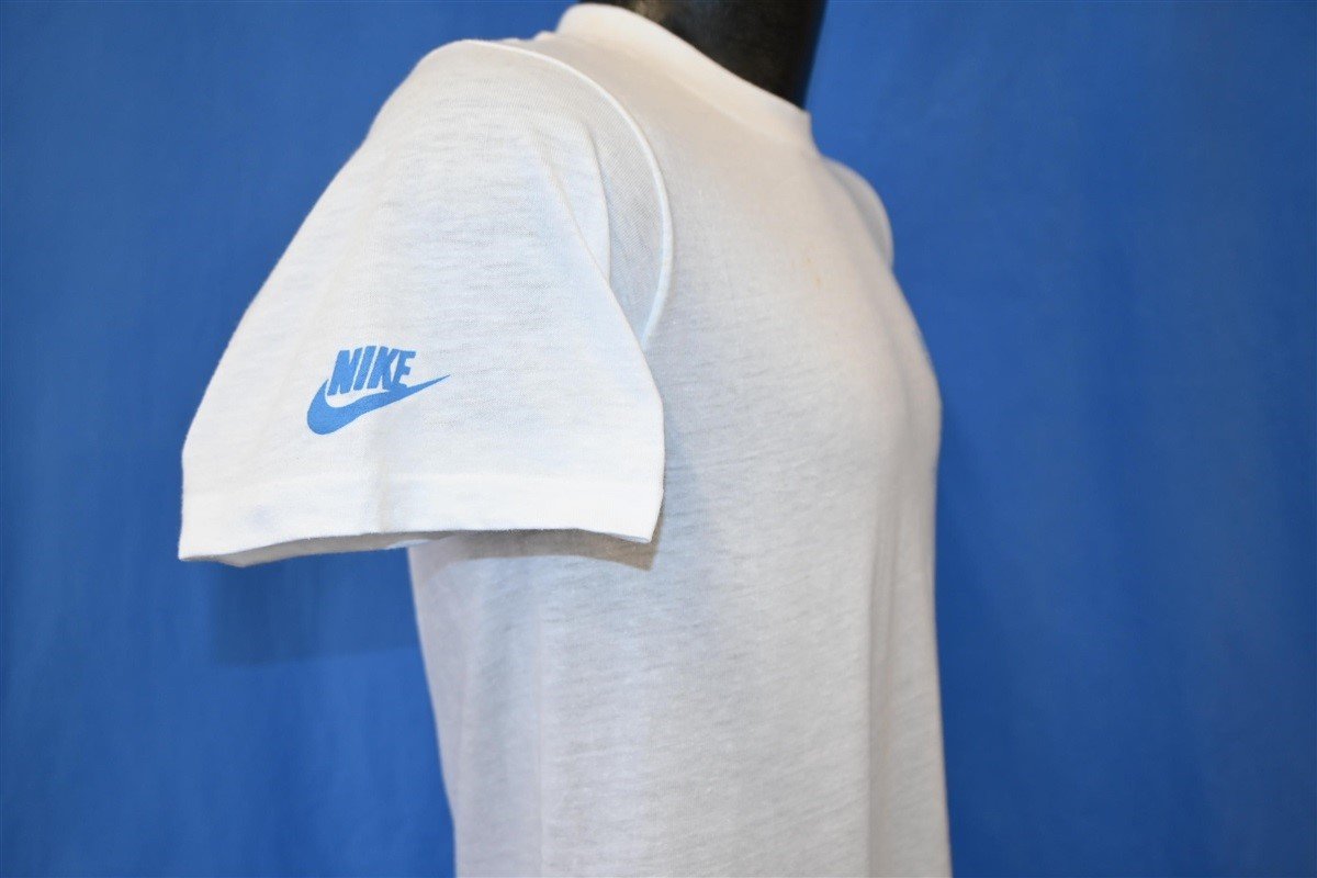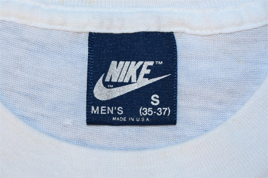 This shirt was made by Nike for a 30K race and 30 mile relay that took place in 1985. The Nike swoosh logo is featured on the sleeve, indicating that the multinational footwear company served as a sponsor for the race. However the event's title sponsor was an entirely different sportswear retailer, called The Athlete's Foot. The Athlete's Foot was founded in 1971, the same exact year that Blue Ribbon Sports rebranded itself as Nike. Although Nike eventually surpassed TAF in terms of popularity, the company didn't really take off until the late 80s, which is when their "Just Do It" slogan was introduced.