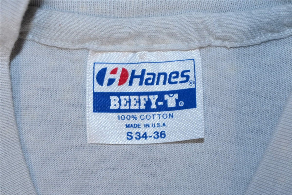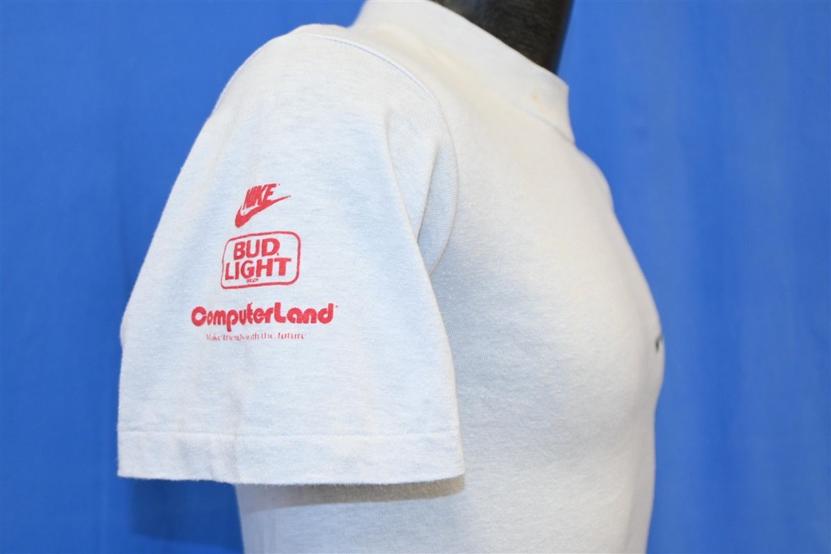 This double-sided tee is for an 8K road race that was held in Hawaii under the title the Runners Route Windward 8K Run. This event was likely organized by the Mid-Pacific Road Runners Club, who have been overseeing running events on the Hawaiian Islands as early as the 1960s. The sleeves of this tee list several sponsors for the race, which include Nike, Bud Light Beer, ComputerLand, Coca-Cola, Regis Hairstylists, and the local radio station KIKI 83 AM.