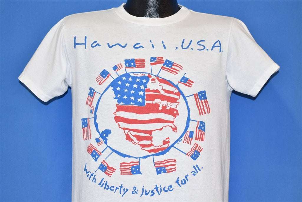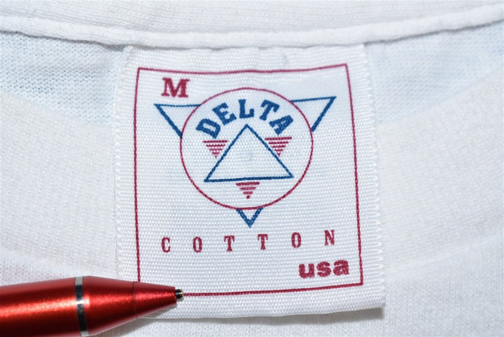 This vintage tee is the perfect getup for Memorial Day or Fourth of July. It's a nineties original loaded with patriotic imagery, one hundred percent cotton, and a classic Delta tag. The graphic spotlights the USA flag, a map of the United States including Hawaii, and the iconic phrase "With liberty and justice for all".