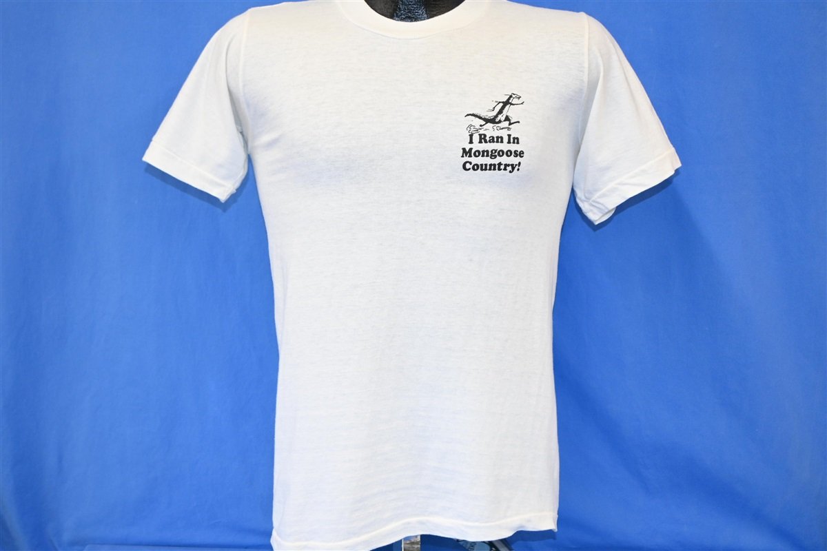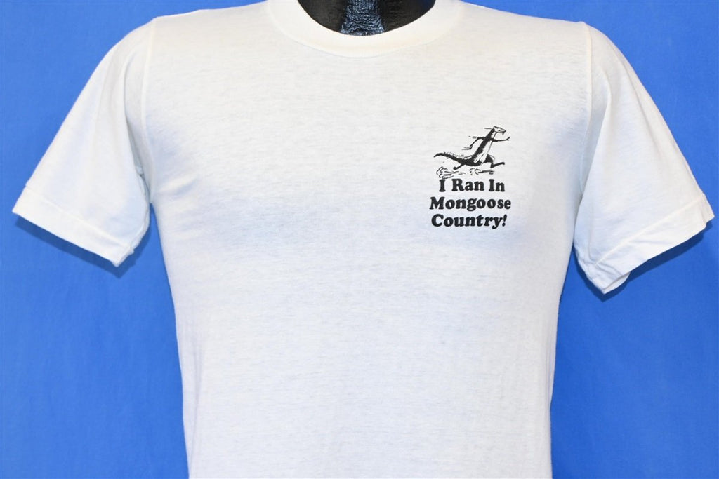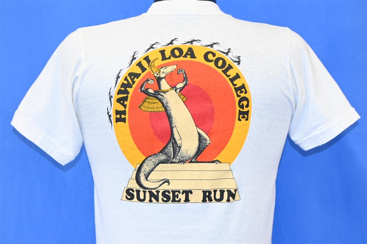 This cool shirt commemorates the Hawaii Loa College Sunset Run, and it was made by the popular Hawaii-based brand, Poly Tees who gained attention thanks to their bold, tropical graphics. Hawaii Loa College was a small liberal arts school that later merged with Hawaii Pacific University in 1992. The shirt showcases the Hawaii Loa College mascot, which was a mongoose. These small carnivorous mammals are commonly found among the Hawaiian islands, although they are an intrusive species that was originally brought over from India.