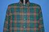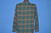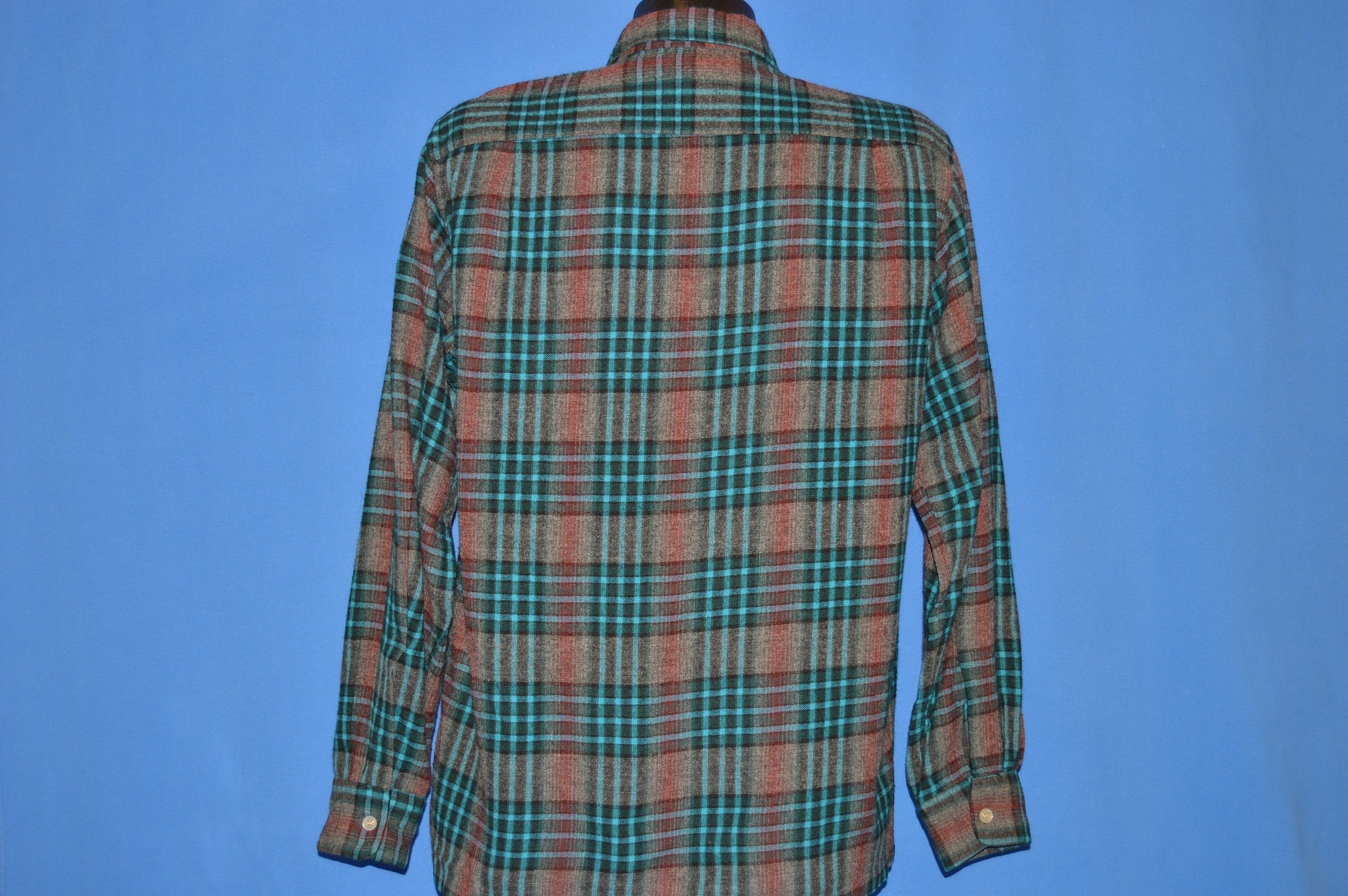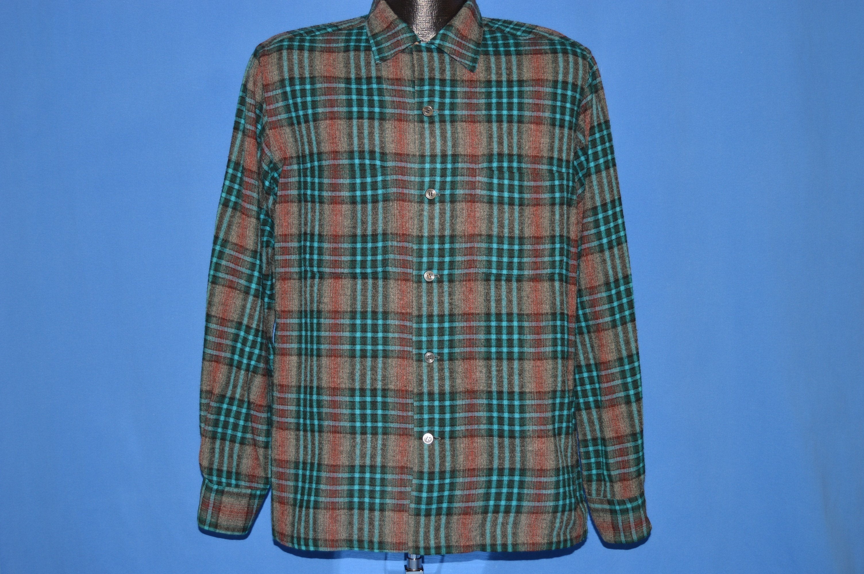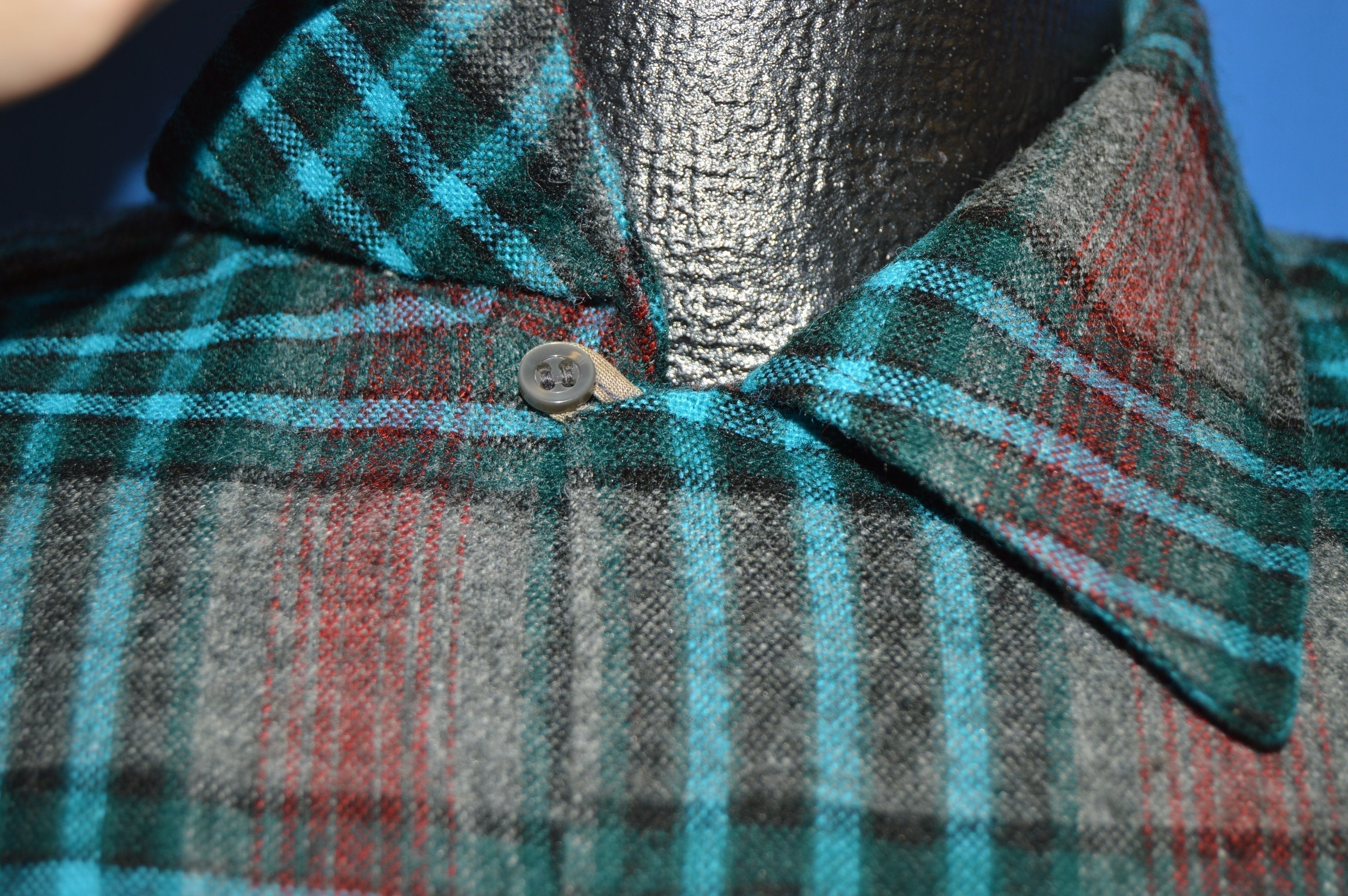 This multi-colored wool shirt is from the 50s and is in excellent condition. The shirt features a green, blue, and brown plaid pattern throughout the shirt. The shirt has five button closures down the front, a loop collar at the top and a square bottom.