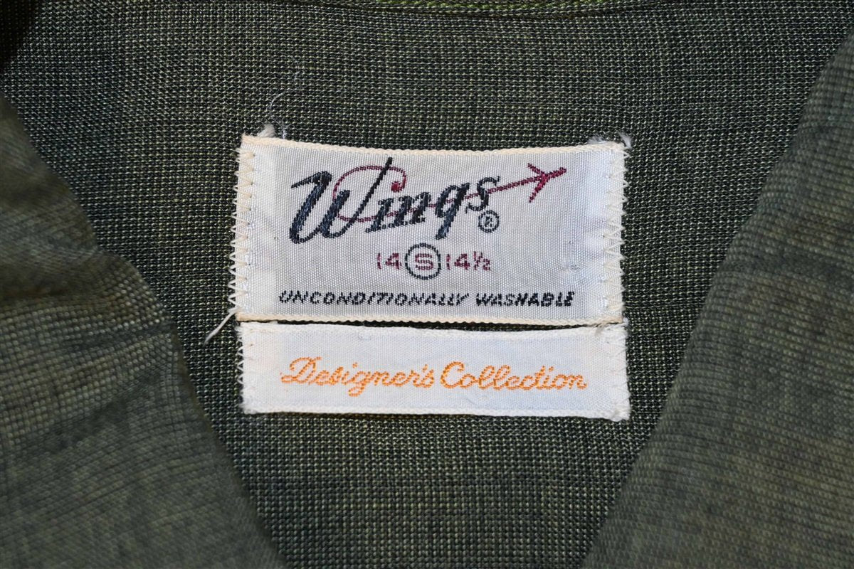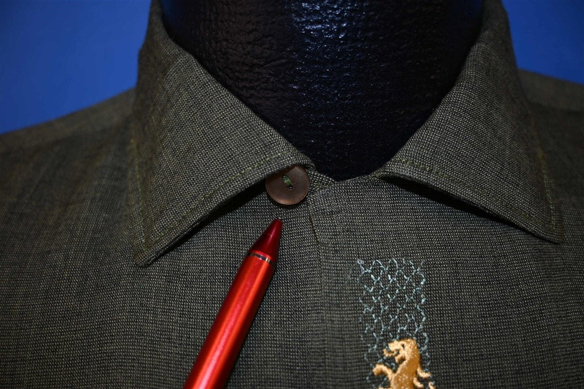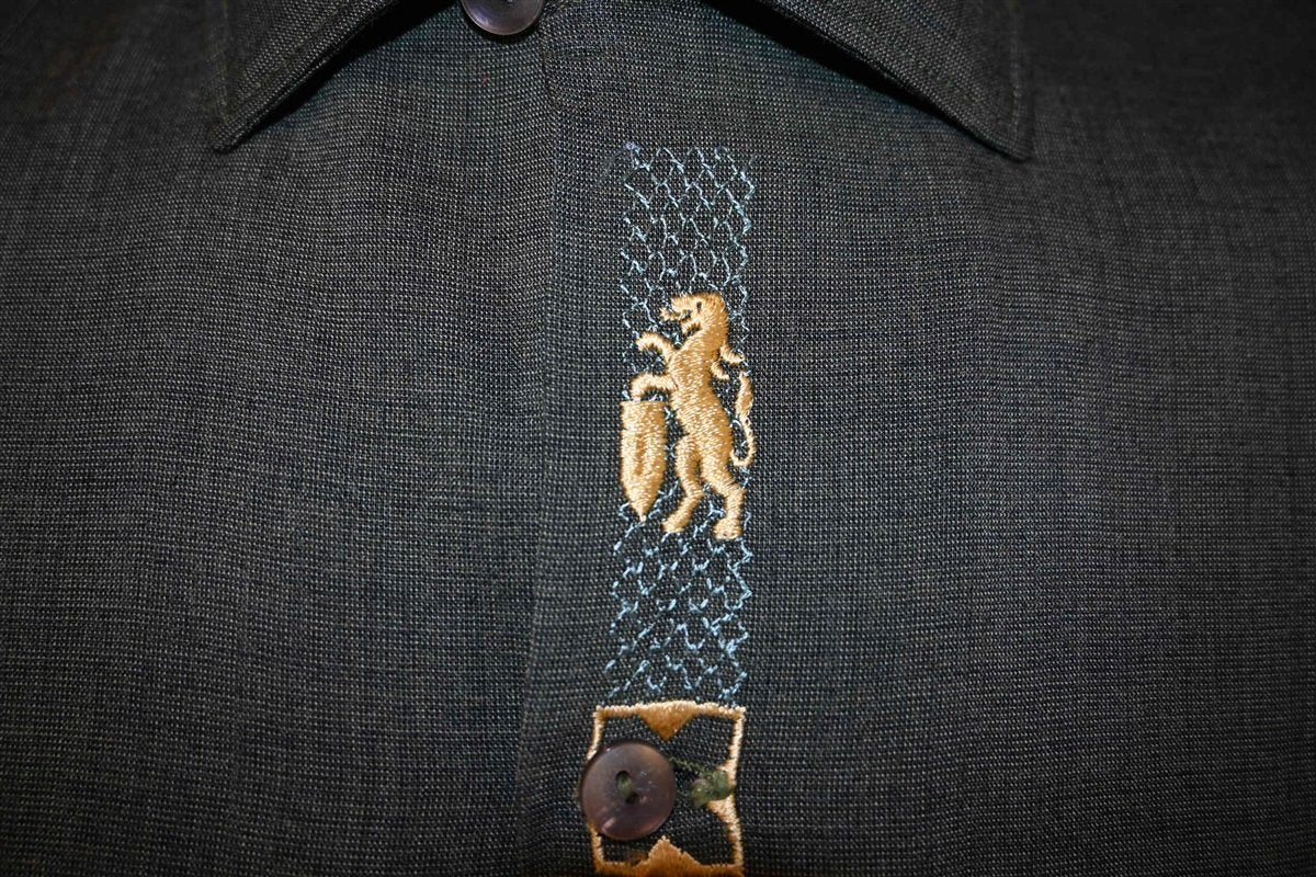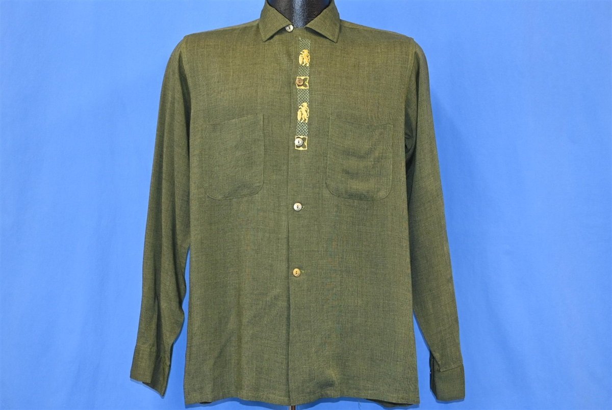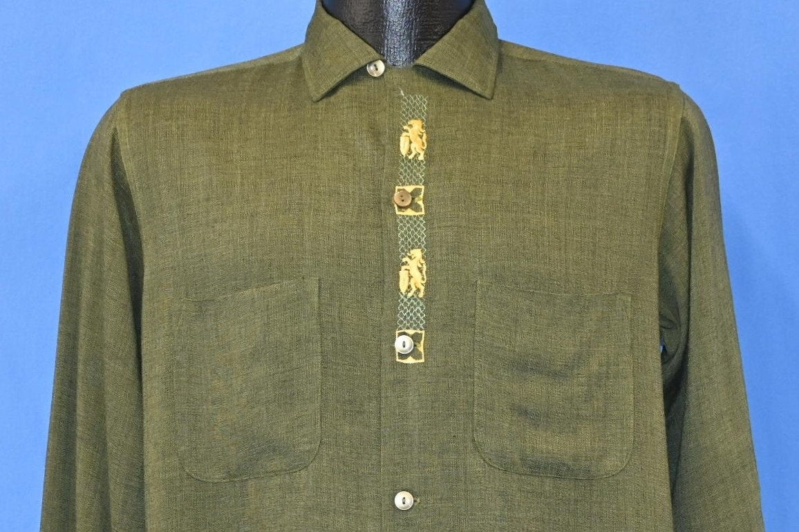 This beautiful vintage button down was made all the way back in the 1950s, and it's held up wonderfully for more than half a century. This shirt is made from a soft cotton blended material and comes in a rich shade of mossy green. The shirt has been decorated with some gold embroidery along the placket, specifically this embroidery features some rampaging lions similar to the ones sometimes seen on medieval coat of arms. This button down also features details like a loop collar and square cut bottom hem.
