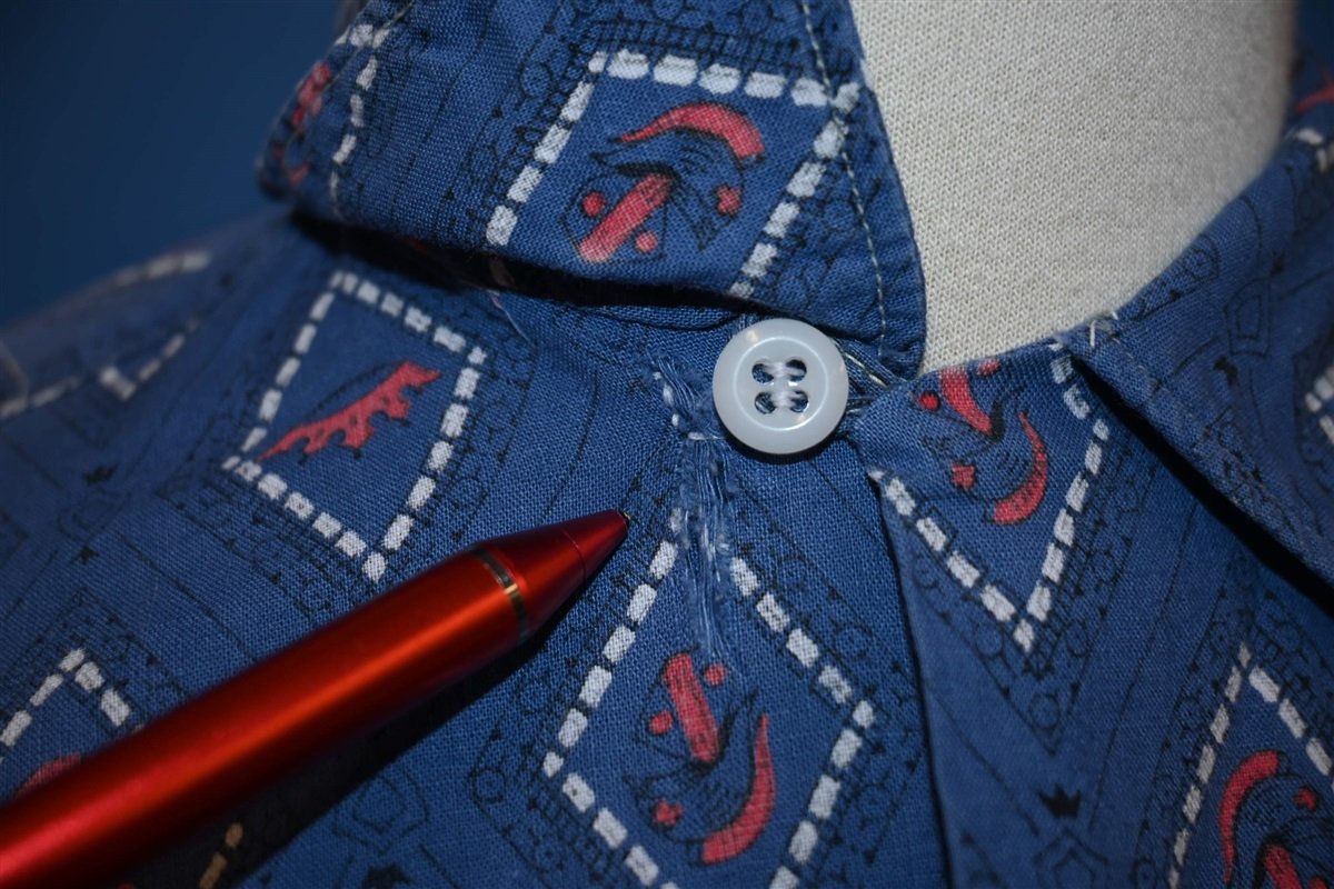 This cool kid's button down was made back in the 60s, and it features a loop collar and a single chest pocket. This shirt comes in a handsome shade of blue and it's decorated with a sweet novelty pattern that shows off small images of a royal crown and the shield and helmet of a medieval knight.
